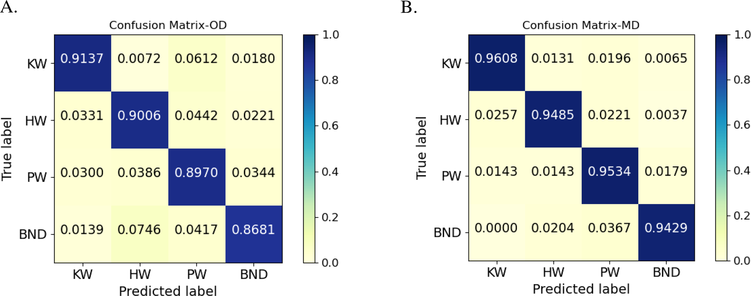 (A) Confusion matrix of the classification model trained with OD; (B) Confusion matrix of the classification model trained with MD.