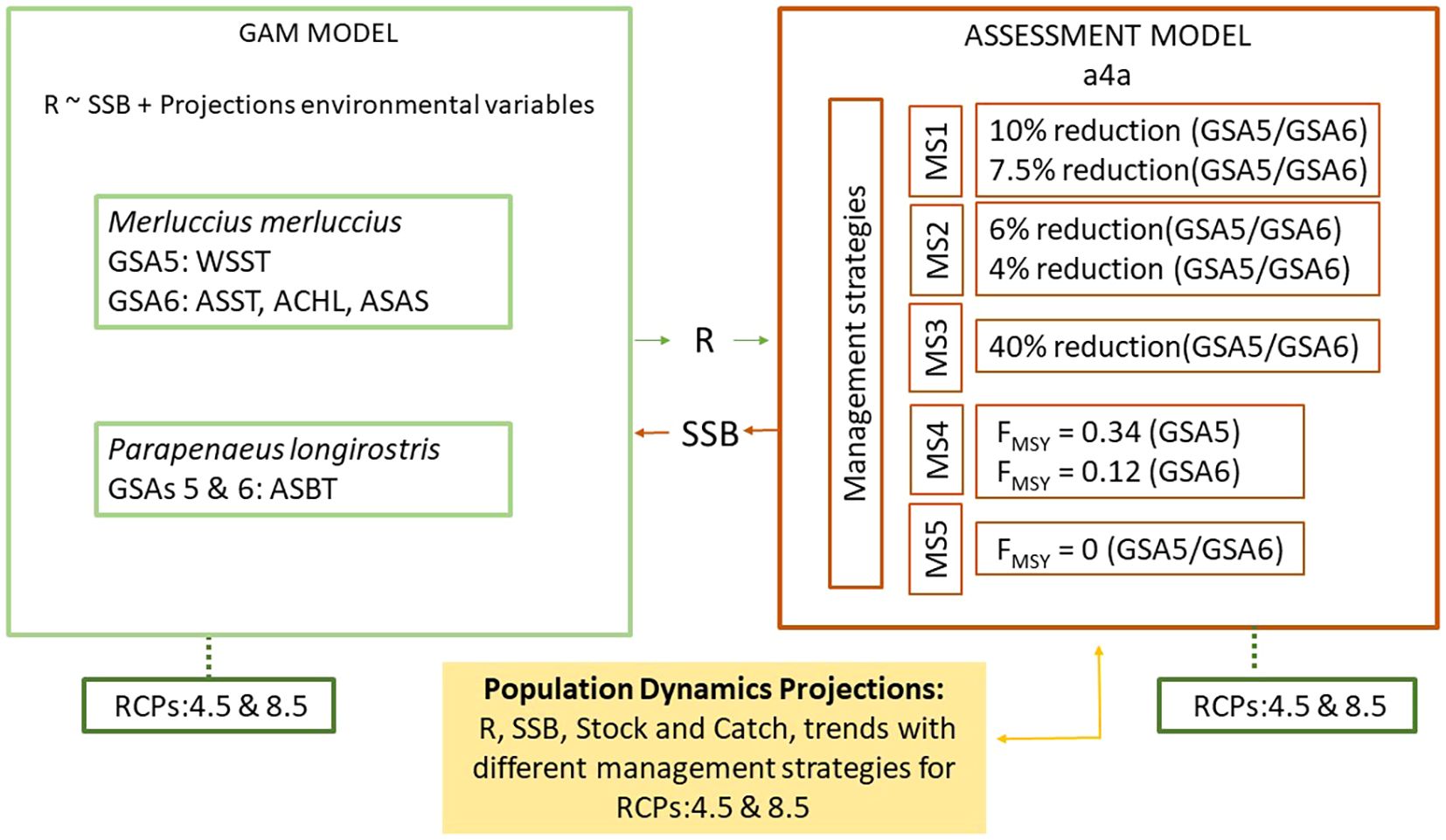 Figure 2. Schemes of the procedure applied for projecting recruitment (R) and spawning stock biomass (SSB) of European hake (Merluccius merluccius) and deep-water rose shrimp (Parapenaeus longirostris) along the 21st century in the FAO-GFCM geographical sub-areas GSA 5 (Balearic Islands) and GSA 6 (Northern Spain). WSST, Winter Sea Surface Temperature; ASST, Annual Sea Surface Temperature; ASAS, Annual Sea Average Salinity; ACHL, Annual Surface Chlorophyll; ASBT, Annual Sea Botton Temperature. MS1, MS2, MS3, MS4 and MS5 correspond to the fishing management strategies 1, 2, 3, 4 and 5, respectively. RCP, Regional Climate Models.