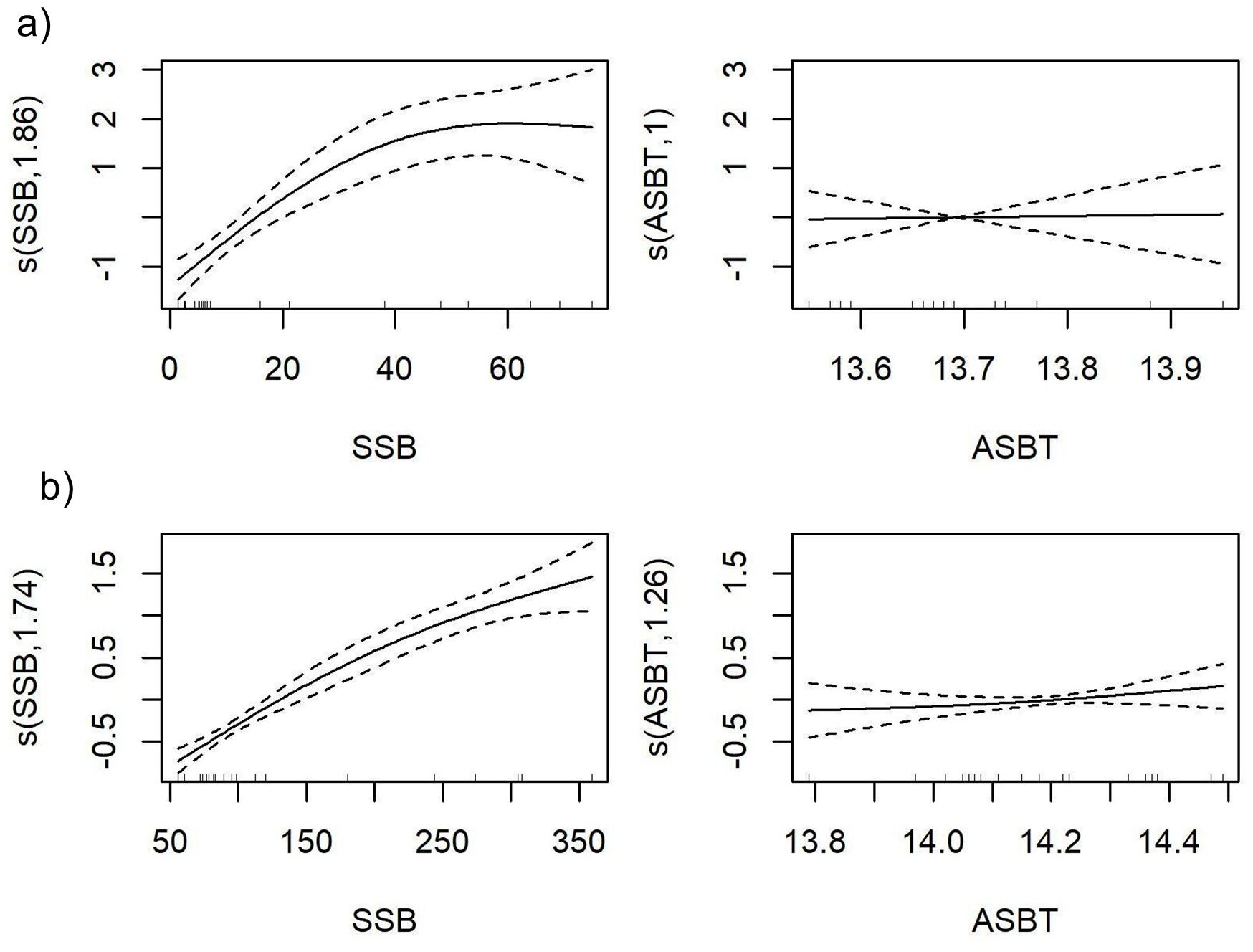 Figure 4. GAM partial plots for the best recruitment models of the deep-water rose shrimp (Parapenaeus longirostris) in the FAO-GFCM geographical sub-areas: (a) GSA 5 (Balearic Islands); and (b) GSA 6 (Northern Spain). The Y axis (logit scale) represents the recruitment probability and the X axis represents the range of values of the predictor variables SSB, Spawning Stock Biomass; ASBT, Annual Sea Bottom Temperature.