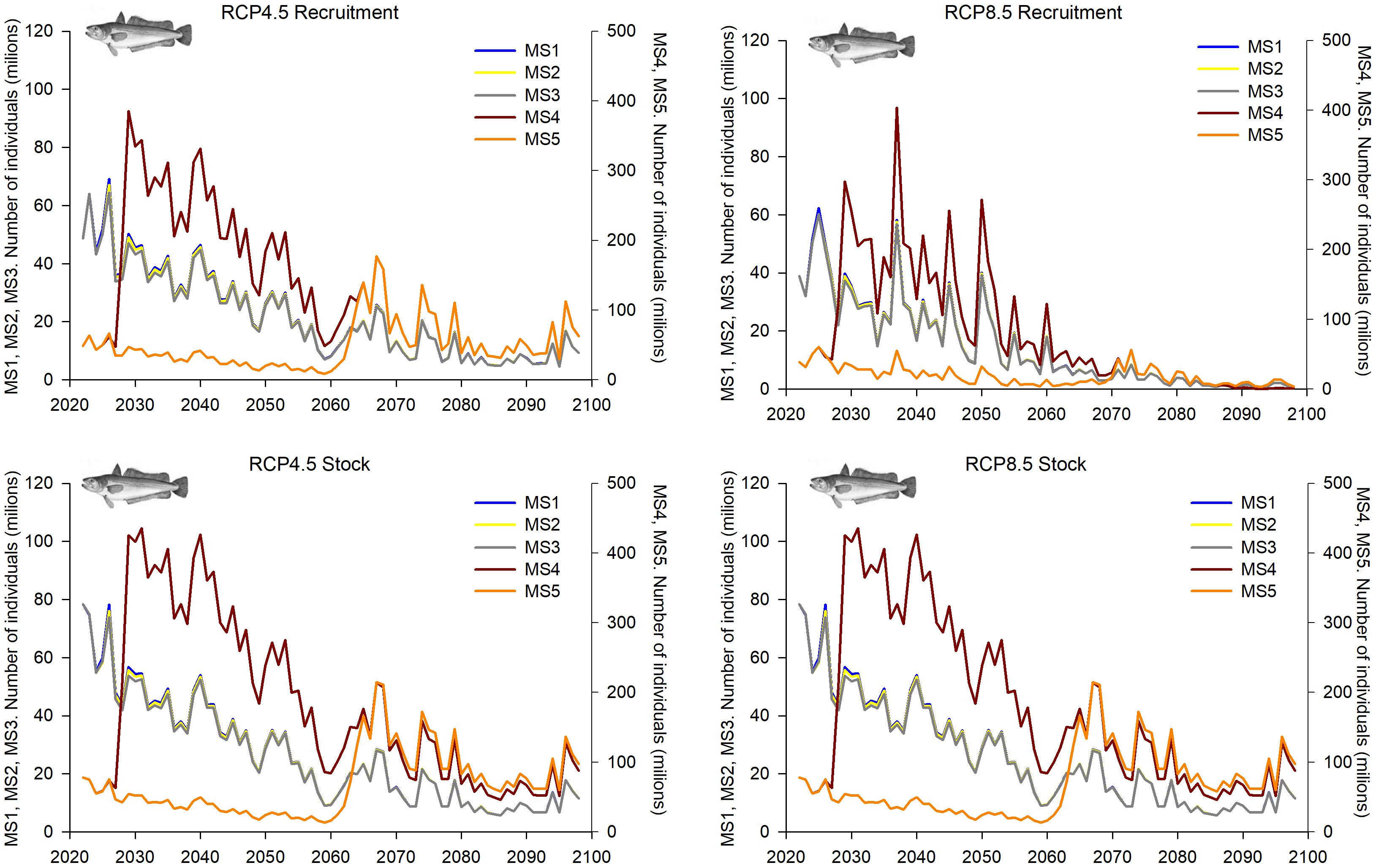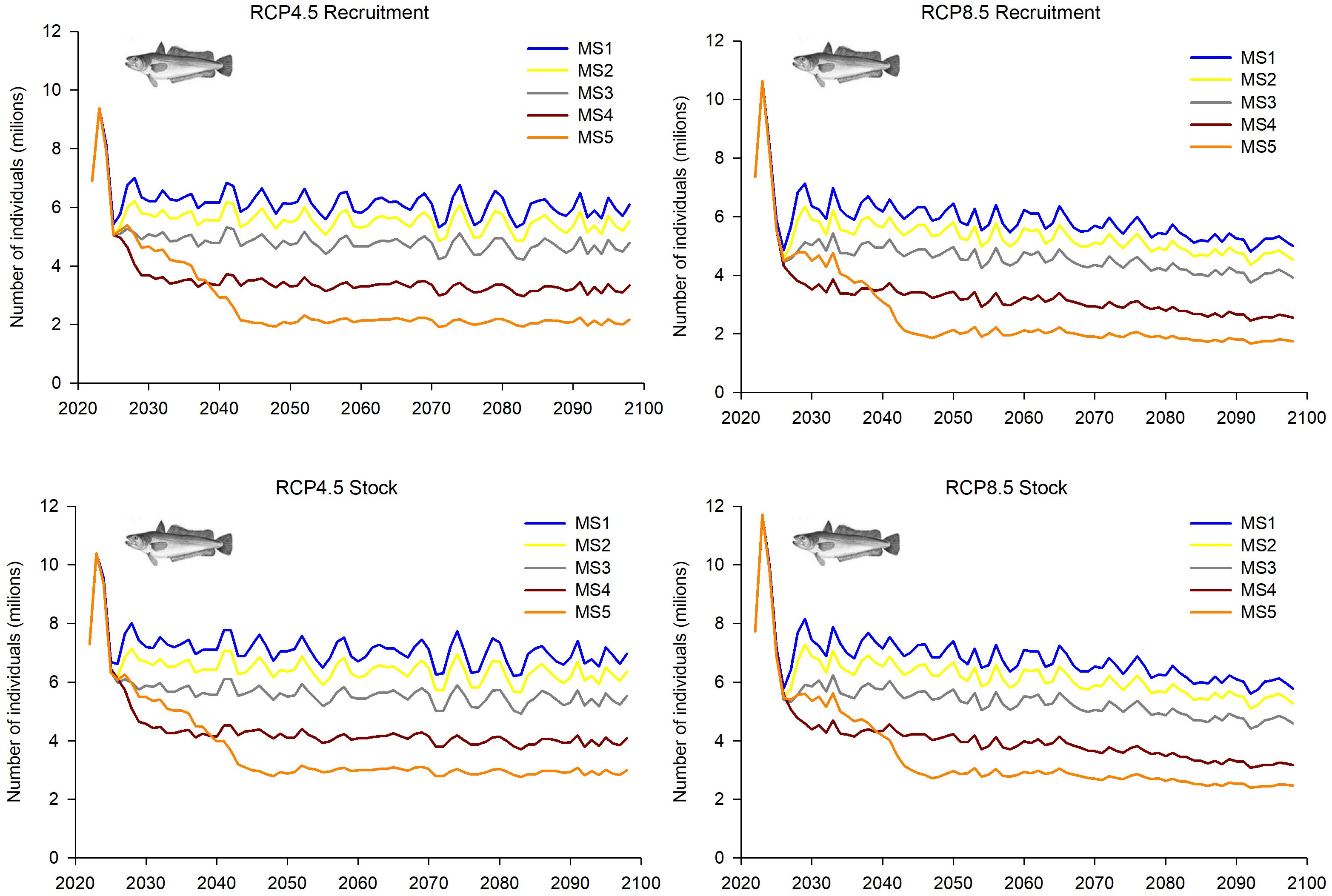 It is important to acknowledge several limitations in the current modeling approach. First, the model assumes static relationships between environmental variables and species recruitment over the period studied (up to 80 years), which may overlook potential temporal changes due to evolutionary adaptations or shifting environmental regimes. Additionally, multispecies interactions, habitat shifts, and abrupt ecosystem changes such as regime shifts have not been incorporated. These factors can significantly affect population dynamics and may introduce additional uncertainty into projections. Explicitly recognizing these limitations is essential, and future research should aim to integrate these complex ecological processes to improve model accuracy and applicability.