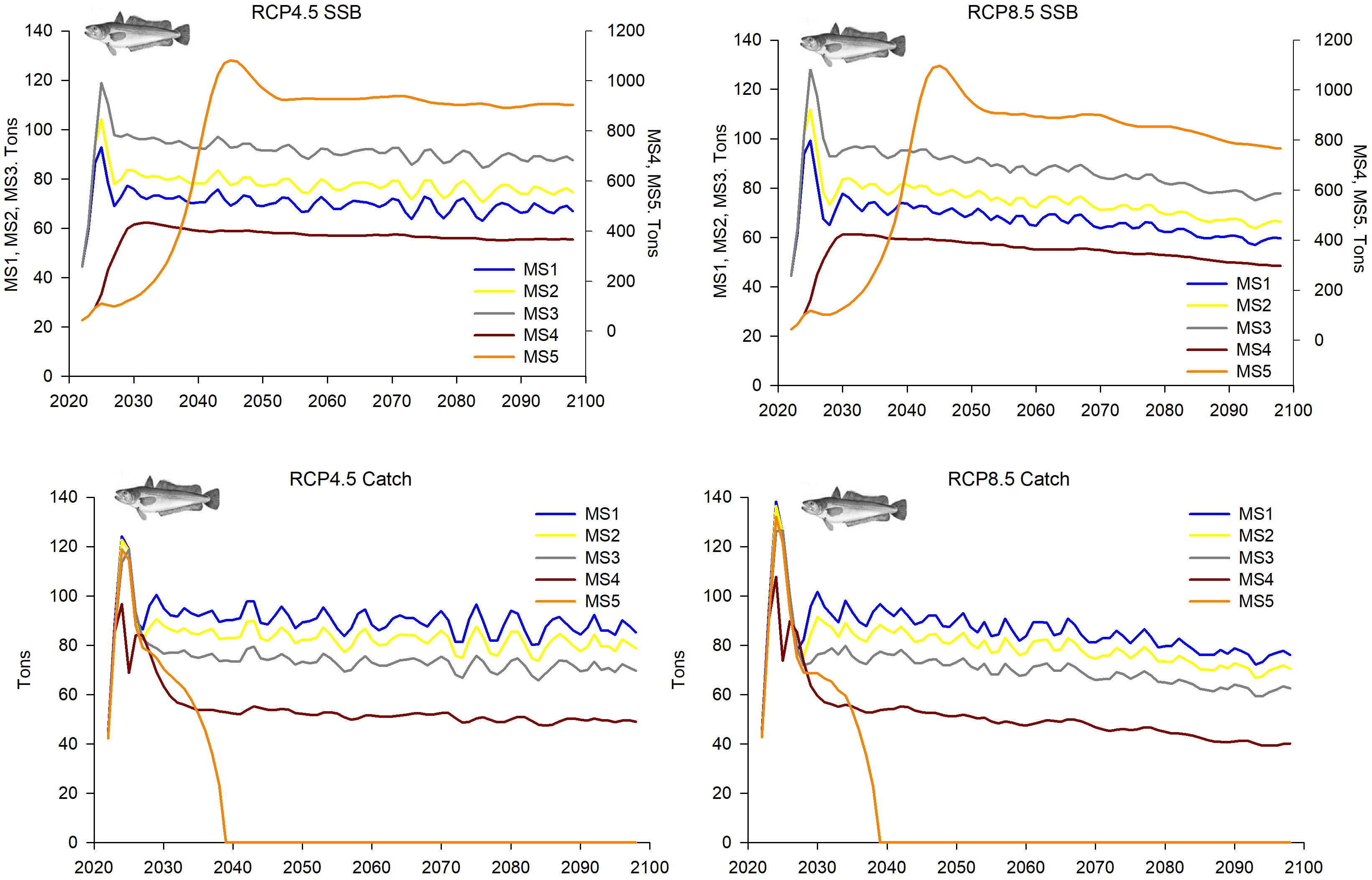 Although some common patterns in the population dynamics of European hake were observed in both GSAs under fishing management strategies (MSs) 1, 2 and 3 and climatic scenarios RCPs 4.5 and 8.5 (Figures 5–8), no consistent patterns were observed in R and SSB between GSAs under the more extreme MSs 4 and 5. In general, MSs 1–3 showed decreasing trends in R, SSB and catches along the whole time period under both RCPa 4.5 and 8.5, although greater fluctuations were observed in GSA 6 under RCP 8.5 compared to RCP 4.5.