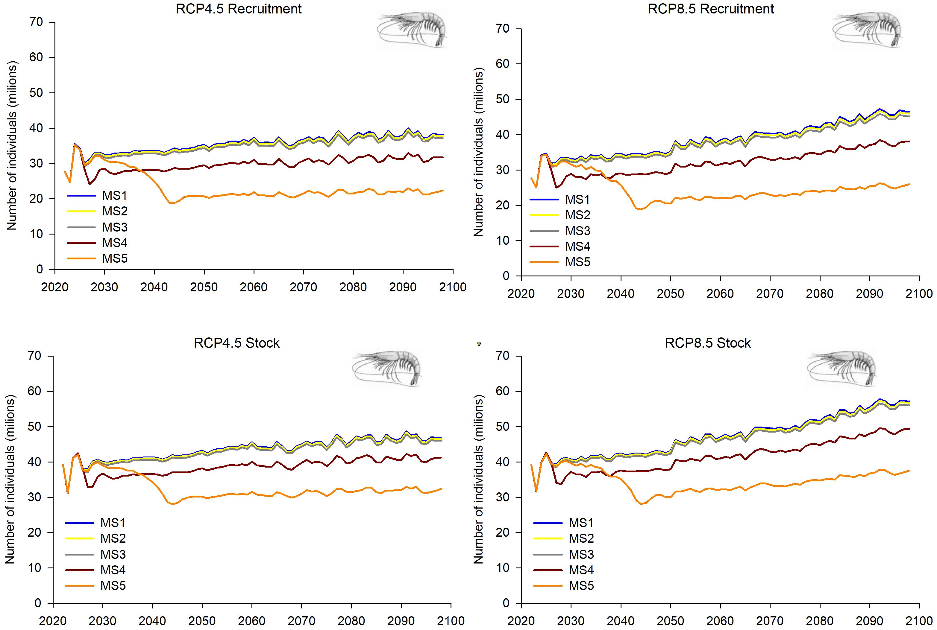 Figure 11. Predictions and projections along the 21st century of the recruitment and the overall stock of deep-water rose shrimp (Parapenaeus longirostris) in the FAO-GFCM geographical sub-area GSA 6 (Northern Spain), under the five fishing management strategies considered (see Material and methods and Figure 2 for more details) and the Regional Climatic Models under two climatic scenarios (RCP 4.5 and RCP 8.5).