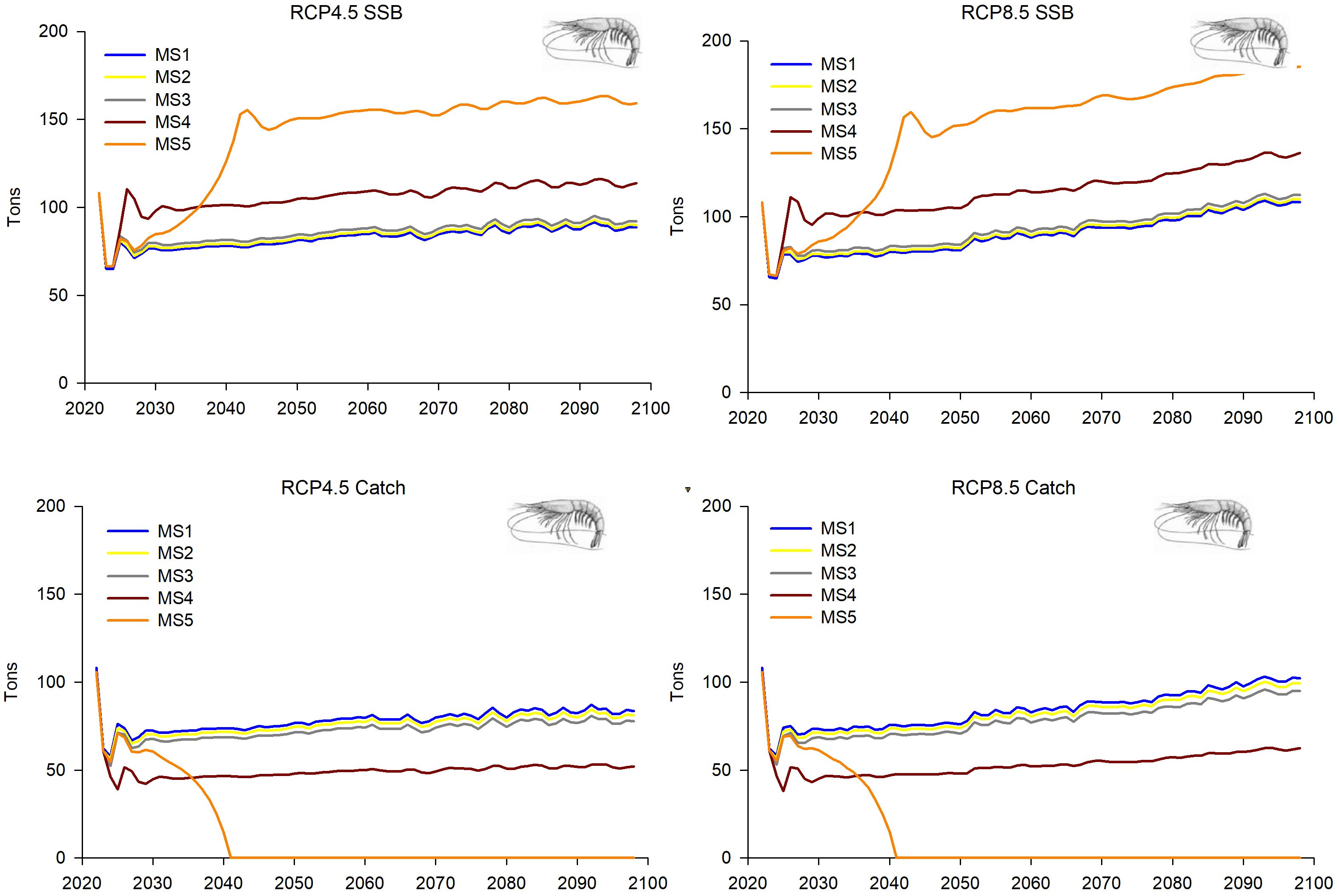 GSA 6 showed quite similar trends in the population dynamics of deep-water rose shrimp within the MSs 2–5 for R, overall stock and SSB, reaching higher values in the most severe climatic scenario (RCP8.5). These projections showed a greater increase in the first decade, followed by gradual growth (Figures 11, 12). The management strategy with the greatest fishing restriction, MS 4, presents the lowest values of R, overall stock, SSB and catches, although its trend is one of growth, being more notable in the RCP 8.5 climate scenario, where the greatest growth appears in 2070 (Figures 11, 12).