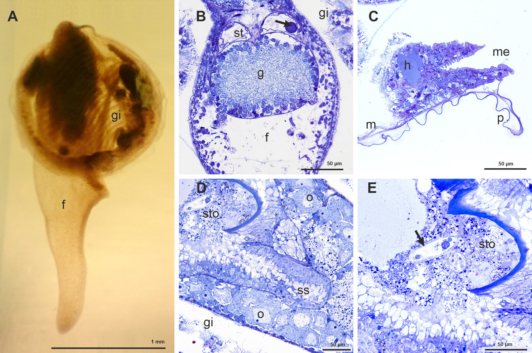 (A) View of one specimen of Kelliella miliaris embedded in spur resin. (B) Semithin transversal section showing part of the foot (f), with the large fused pedal ganglia (g) and the statocists (st); the arrow shows one of the statoliths. (C) Semithin transversal section of the very large mantle edge (me) -in comparison with the mantle (m)- showing a large hemocelic sinus (h) and the periostracum (p) emerging between the outer and middle mantle folds. (D) Semithin transversal section showing part of the stomach (sto) and the style sac (ss). (E) Semithin transversal section showing part of the stomach (sto) with different organisms, among them a possible protozoan (arrow).