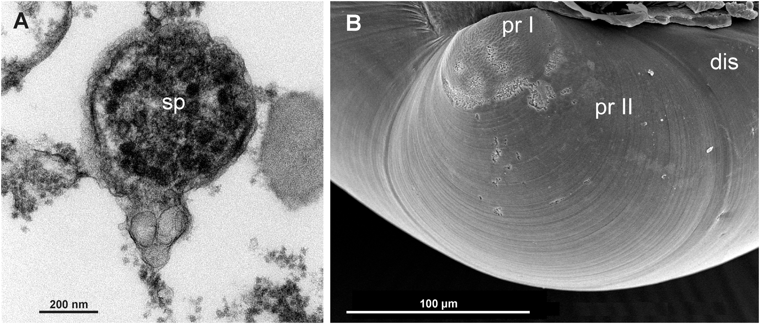 (A) Transmission Electron Microscope (TEM) view of a spermatozoid found inside the female gonad. (B) Scanning Electron Microscope (SEM) view of the protoconch I (pr I), protoconch II (pr II) and disoconch (dis) of Kelliella miliaris, indicative of a planktotrophic development.