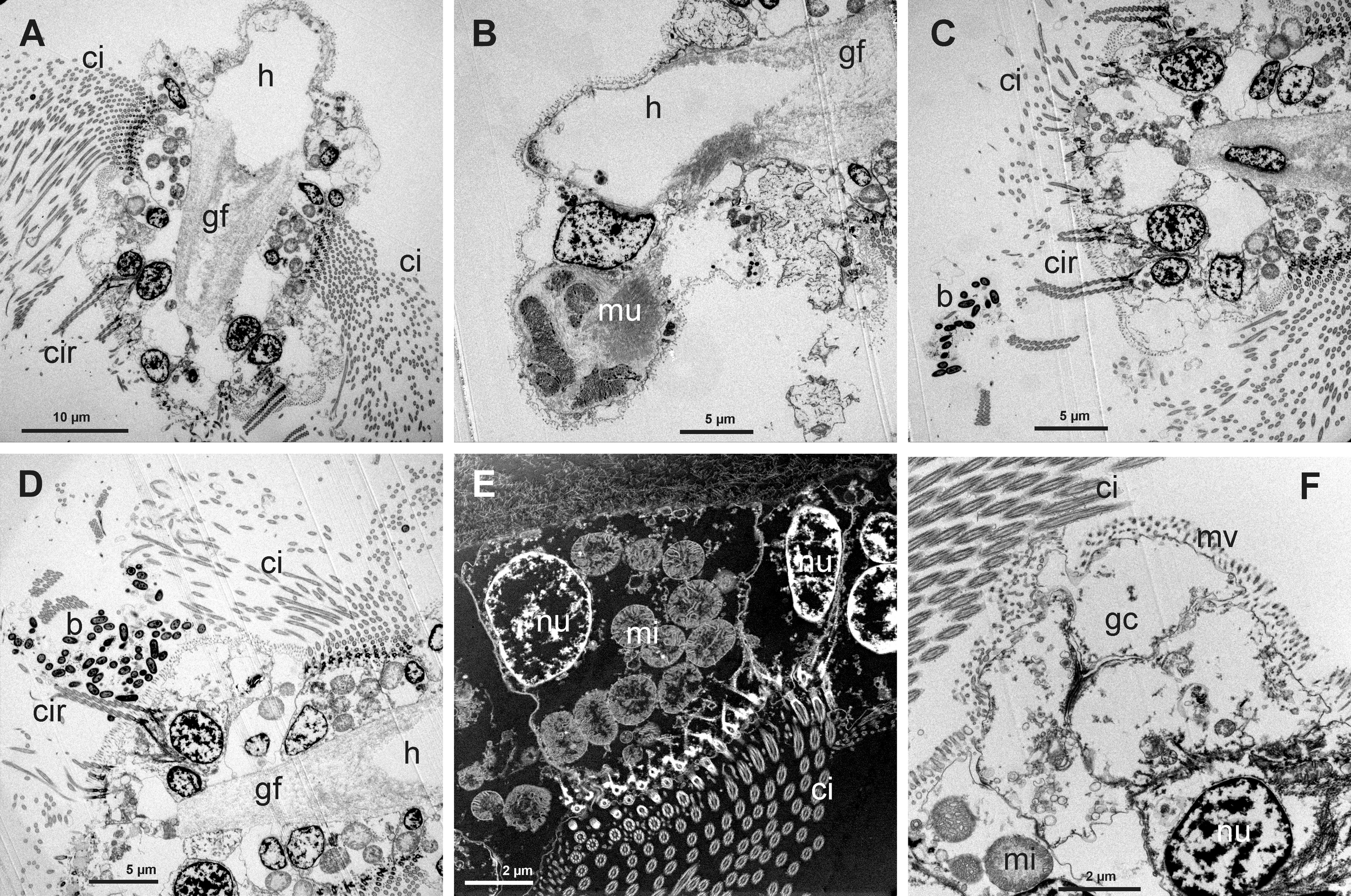 (A) Transmission Electron Microscope (TEM) view of a gill filament (gf) showing the long lateral cilia (ci), frontal cirri (cir) and the large hemocelic sinus (h). (B) TEM view of part of the gill filament (gf) with the hemocelic sinus (h) connected to a bunch of muscular fibers (mu). (C) Frontal TEM view of a gill filament showing a group of bacteria (b) near the frontal cirri (cir); it is possible to see part of the long lateral cilia (ci). (D) TEM view of a group of bacteria (b) located between the frontal cirri (cr) and the long lateral cilia (cir). (E) Scanning Transmission Electron Microscope (TEM-STEM) view of the lateral ciliate cell showing the cilia (ci), the nucleus (nu) and numerous mitochondria (mi); some nuclei from the abfrontal cells are visible. (F) TEM view of the abfrontal and globular cells (gc) located between the lateral ciliate cells and the frontal cells. These globular cells present only microvilli.