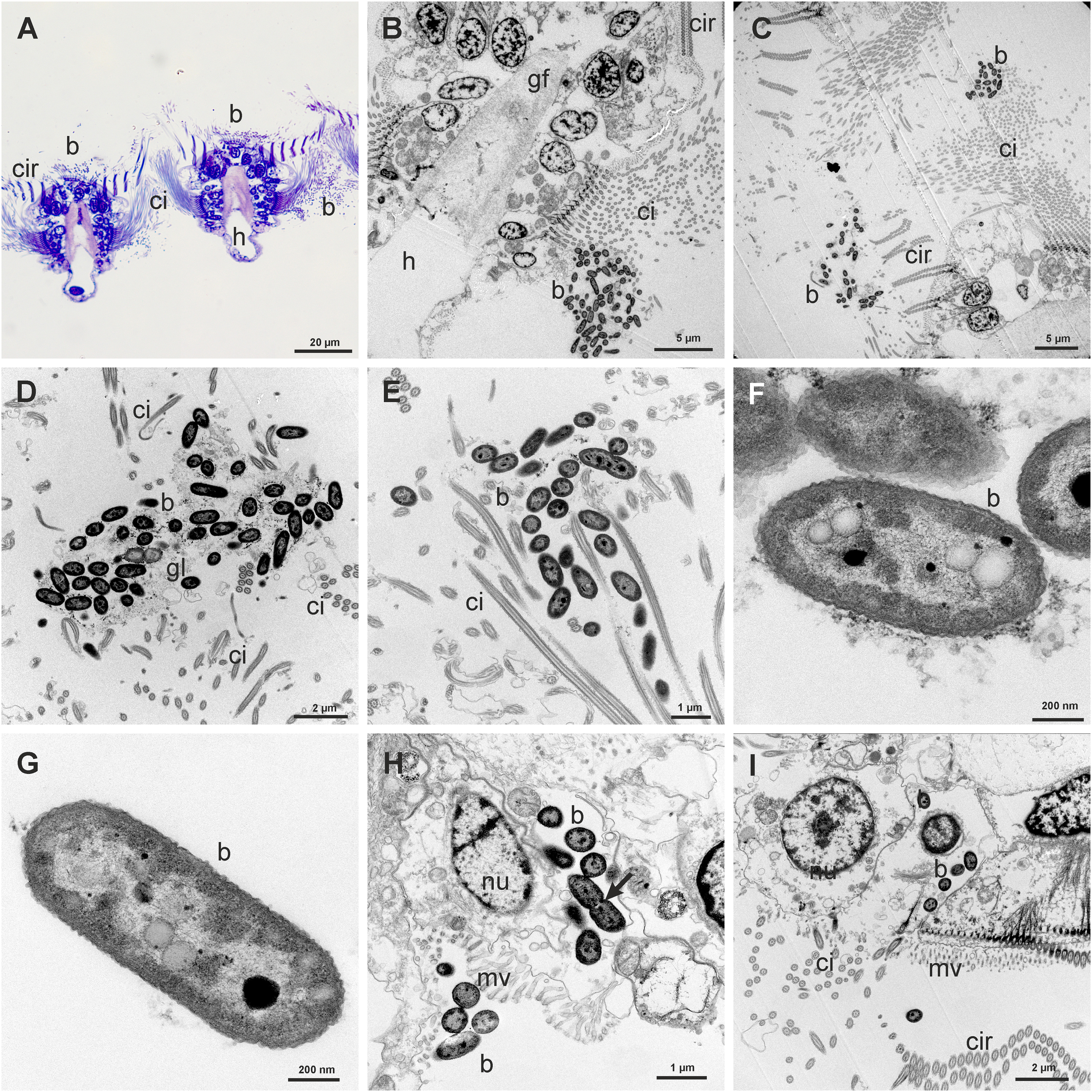 (A) Semithin transversal view of two gill filaments showing groups of bacteria (b) in the frontal and lateral sides. (B) Transmission Electron Microscope (TEM) view of a gill filament (gf) showing a group of bacteria (b) between the long lateral cilia (ci). (C) TEM view of groups of bacteria (b) in the frontal and lateral cilia (ci) of a gill filament. (D, E) Detail of groups of bacteria (b) trapped in a glycocalix network (gl) between the cilia (ci). (F) TEM view of bacteria showing the double membrane and the electron-lucent and electron-dense granules. (G) TEM view of one isolated rod shaped bacterium showing two electron-lucent granules and one electron-dense granule. (H) Group of bacteria inside the cytoplasm of a microvillous (mv) abfrontal cell, one of them in process of division (arrow). There is also a group of bacteria in process of entering in another cell. (I) TEM view of some bacteria (b) inside a microvillous frontal cell.