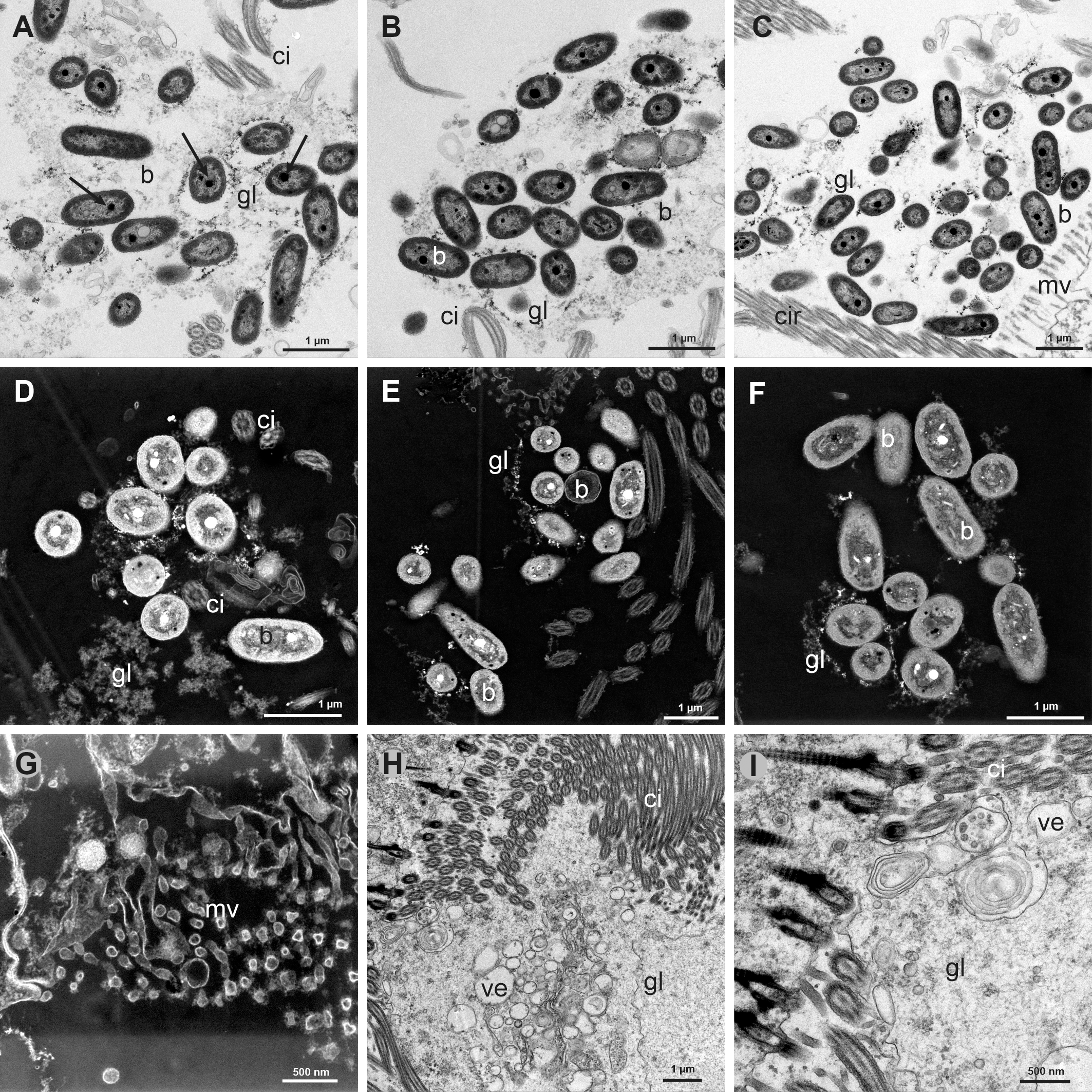 (A-C) Transmission Electron Microscope (TEM) views of groups of bacteria (b) trapped in a glycocalix network (gl) between the cilia (ci) of the gill filaments. Arrows point to some electron-dense granules. (D-F) Scanning Transmission Electron Microscope (TEM-STEM) views of groups of bacteria (b) in the glycocalix network (gl), some of them showing electron-lucent granules, which correspond to the electron-dense granules in TEM. (G) TEM-STEM view of the microvilli (mv) from the abfrontal globular cells. (H) TEM view of the intense secretion of vesicles (ve) and glycocalix (gl) from the microvilli of the gill filament cells. (I) TEM view with intense secretion of vesicles and glycocalix from same section as H.
