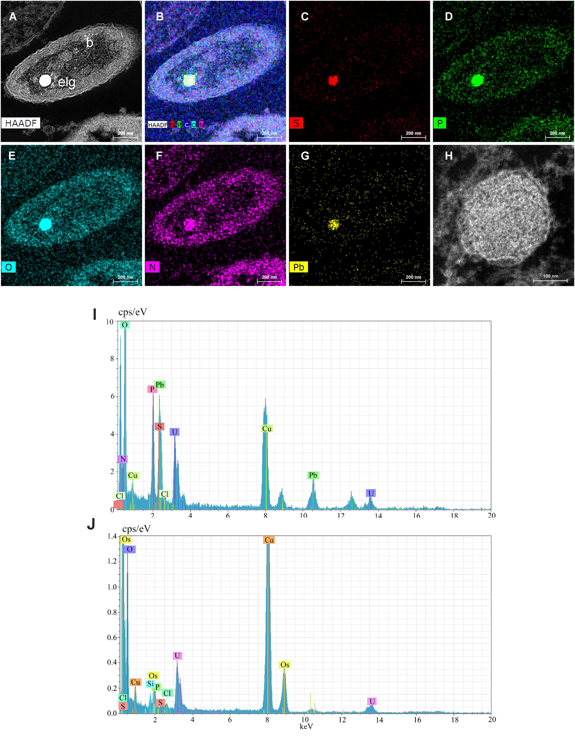 (A-G) Energy Dispersive X-ray analysis on Scanning Transmission Electron Microscope ultrathin sections of bacteria (TEM-STEM-EDX) for mapping the main elements present in the bacteria, particularly in the electron-lucent (electron-dense in TEM view) granule (elg): S, sulfur; P, phosphorus; O, oxygen; N, nitrogen; Pb, lead. (H) Scanning Transmission Electron Microscope (TEM-STEM) view of an electron-lucent granule (electron-dense in TEM). (I) Spectrum of an electron-lucent granule (electron-dense in TEM). (J) Spectrum of an electron-dense granule (electron-lucent in TEM). Most of the conspicuous peaks denote elements used in the fixation process (uranyl U, osmium Os and lead Pb) or the grid (copper Cu).