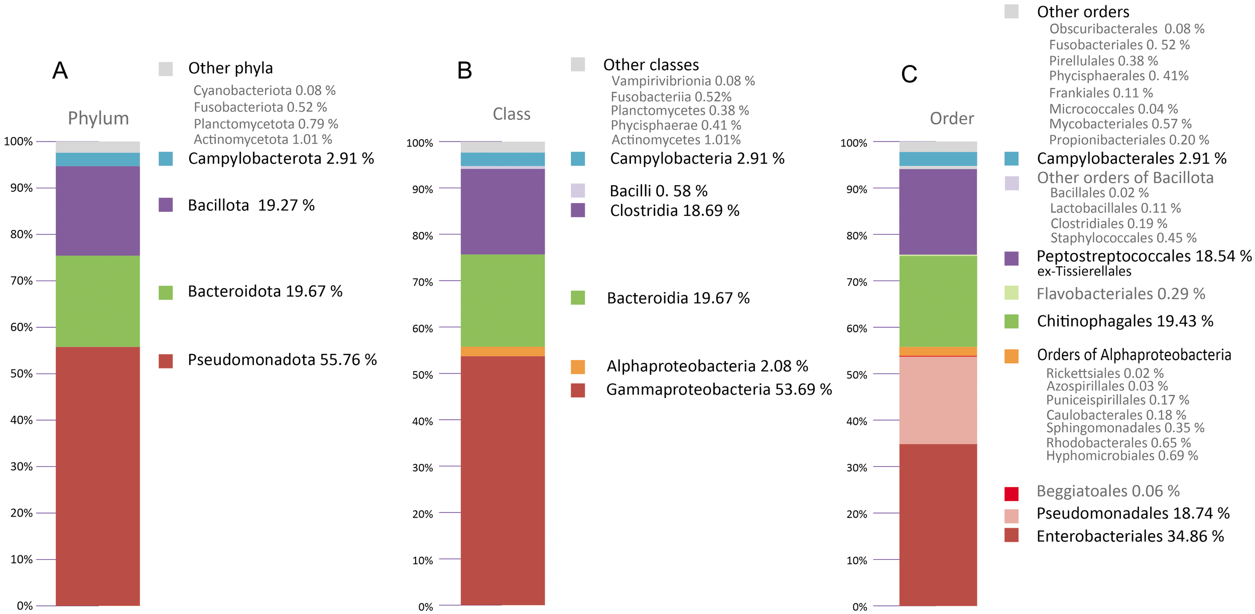 The predominant Phylum detected in the sample was Pseudomonadota (55.76% of total reads) (Figure 7A), of which the class Gammaproteobacteria constituted 53.69% (Figure 7B). The other two more abundant phyla are Bacteroidota (19.67%) (Figure 7A), all of which belong to the class Bacteroidia 19.67% (Figure 7B), and Bacillota (19.27%) (Figure 7A), most of which belong to the class Clostridia (18.74%)(Figure 7B). Regarding the Order, Enterobacterales (34.86%), Pseudomonadales (18.74%) are the most abundant within Gammaproteobacteria; Chitinophagales (19.43%) is almost all the Bacteroidia and Peptostreptococcales (exTissierellales) (18.54%) constituted the main taxonomic group in the class Clostridia (Figure 7C).