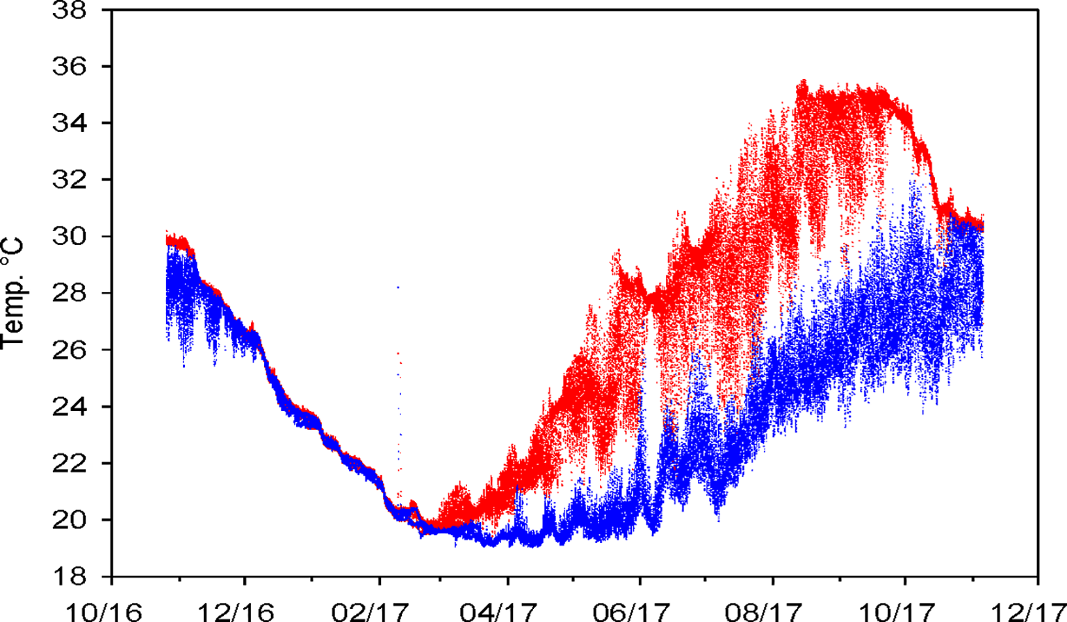 Seawater temperature records from Hobbo© data loggers deployed at 10–15 m (red) and 45–50 m (blue) in each of the 6 vertical structures.
