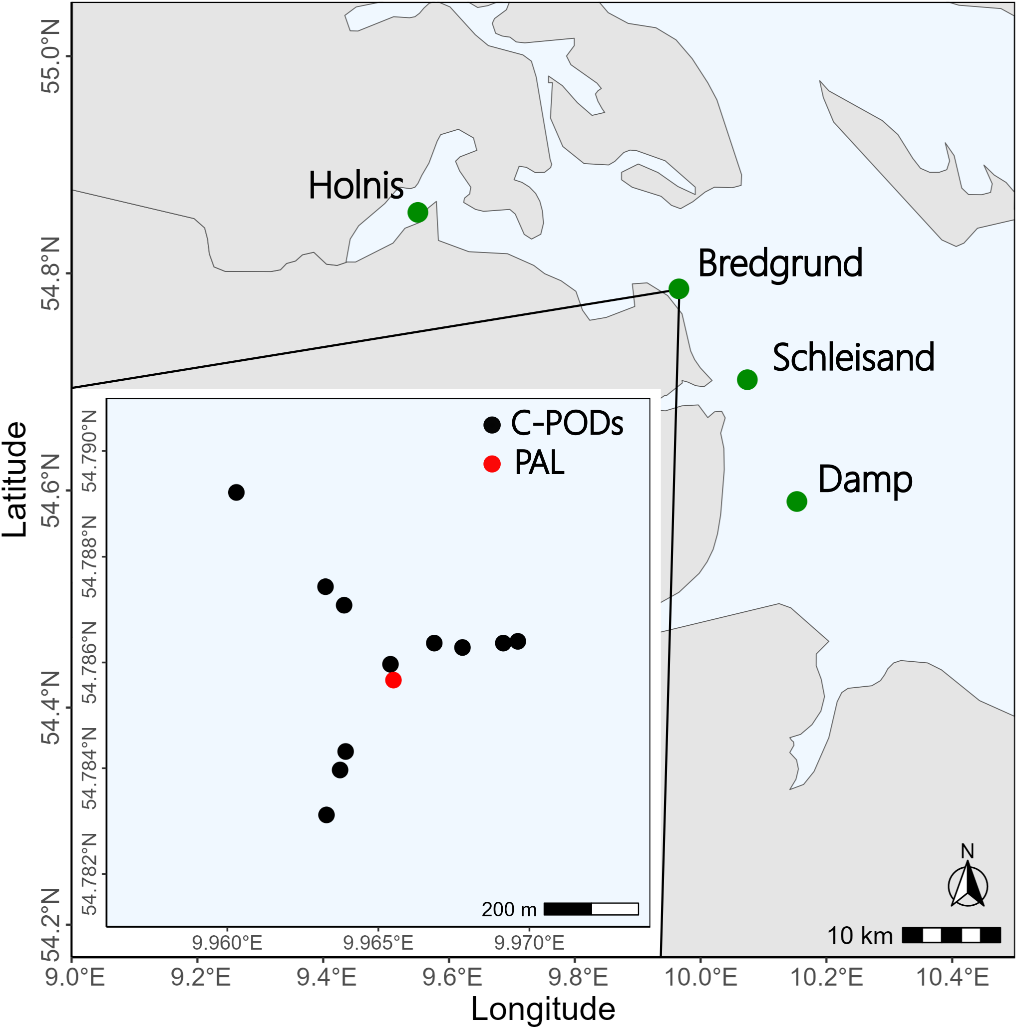 Map of the study site. Locations of the C-POD monitoring stations in the coastal area of the Baltic Sea of Schleswig-Holstein are shown as green dots on the map. The bottom-left figure represents a close-up of the Bredgrund experimental array, where stationary C-PODs (black dots) were deployed around a central PAL device (red dot).