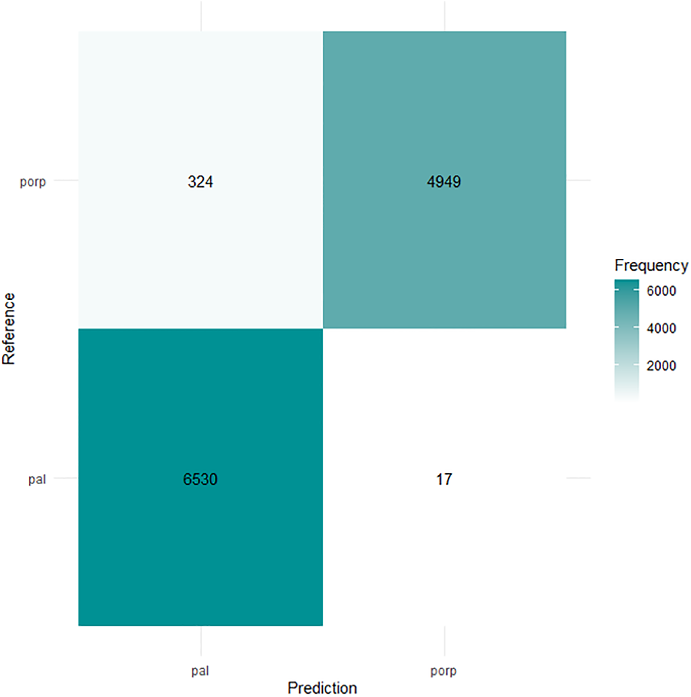As illustrated in Figure 2, the confusion matrix of the test dataset, which comprised 11,820 observations, exhibited approximately equal proportions of manually defined “pal” (55.39%) and “porp” (44.61%) by the ensemble. The ensemble showed an overall accuracy of 97.12% in the test set, with a high capacity of correctly identifying porpoise calls (sensitivity = 99.74%). Likewise a specificity of 93.86% showed a high, albeit lower capacity of the model to identify PALs. The positive and negative predictive value of 95.27% and 99.66%, respectively indicates that the number of false positives (calls identified as porpoises when they are actually PALs) and false negatives (calls identified as PALs when they are actually porpoises) is very low. In general, the model showed excellent performance in the test dataset.