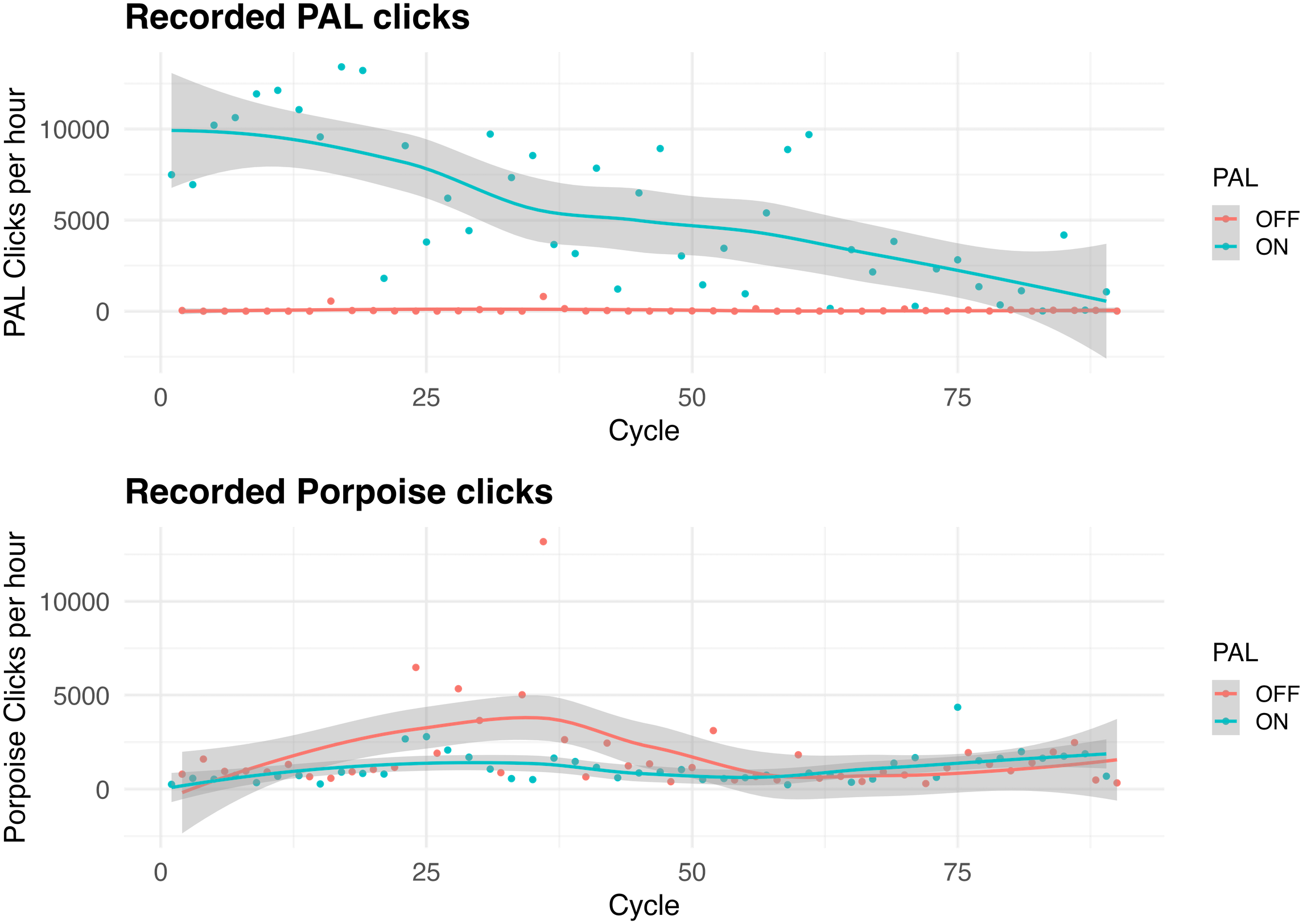 The lower panel provides a relative abundance of porpoise clicks throughout the experiment. It is evident that during the initial twenty days, porpoise activity levels were minimal, and that in the second quarter of the experiment, particularly between cycles 25 and 50, a significantly higher ratio of porpoise clicks was recorded. A further notable observation is that a greater number of porpoise clicks (63%) were recorded when the PAL device was deactivated, as opposed to only 37% when the PAL was operational. This difference was confirmed by a paired Wilcoxon signed-rank test, which indicated higher click rates during PAL-OFF than PAL-ON (V = 684, p = 0.030, one-sided).