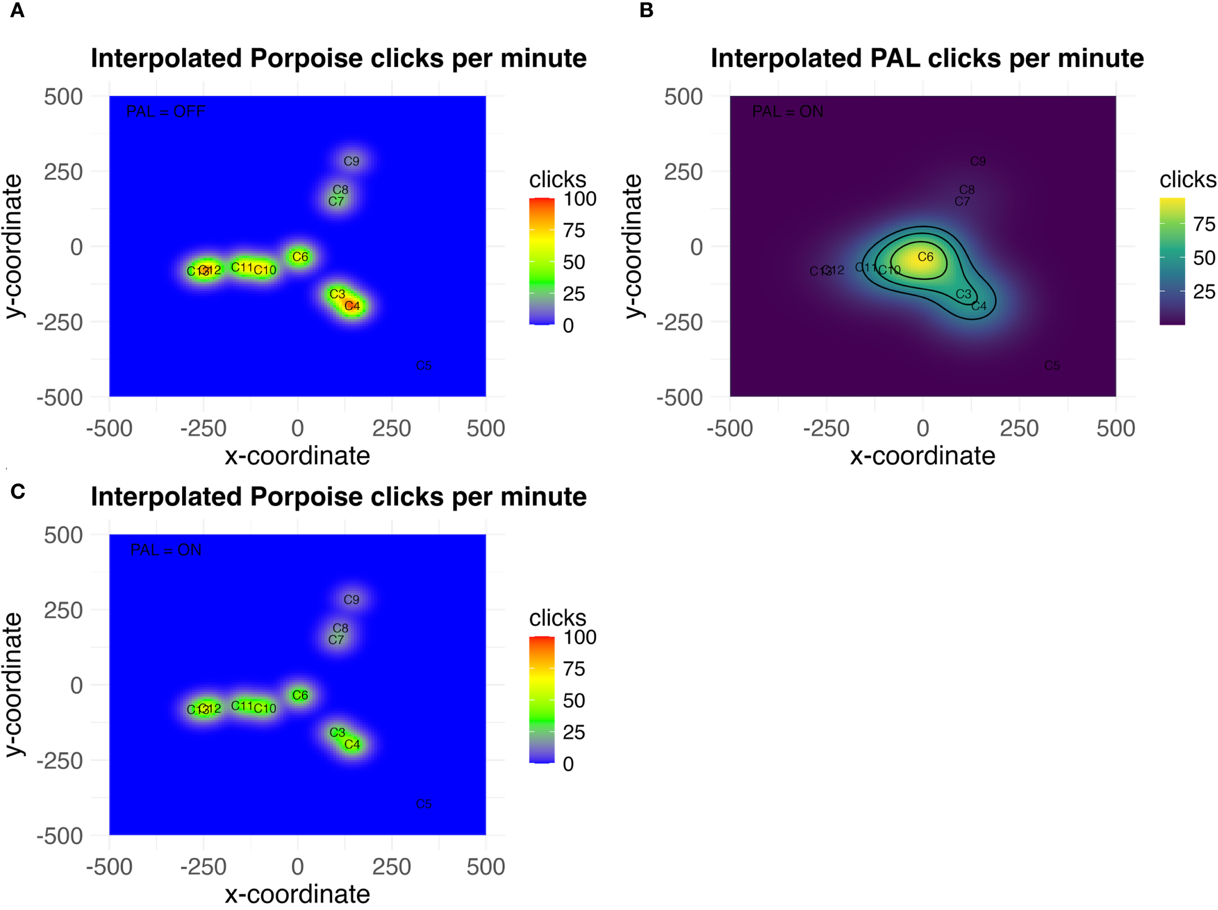 2D kernel density plot of clicks per minute recorded at each recording station. (A) shows porpoise clicks recorded when PAL was OFF, (B) shows PAL clicks recorded when PAL was ON, and (C) shows porpoise clicks recorded when PAL was ON.