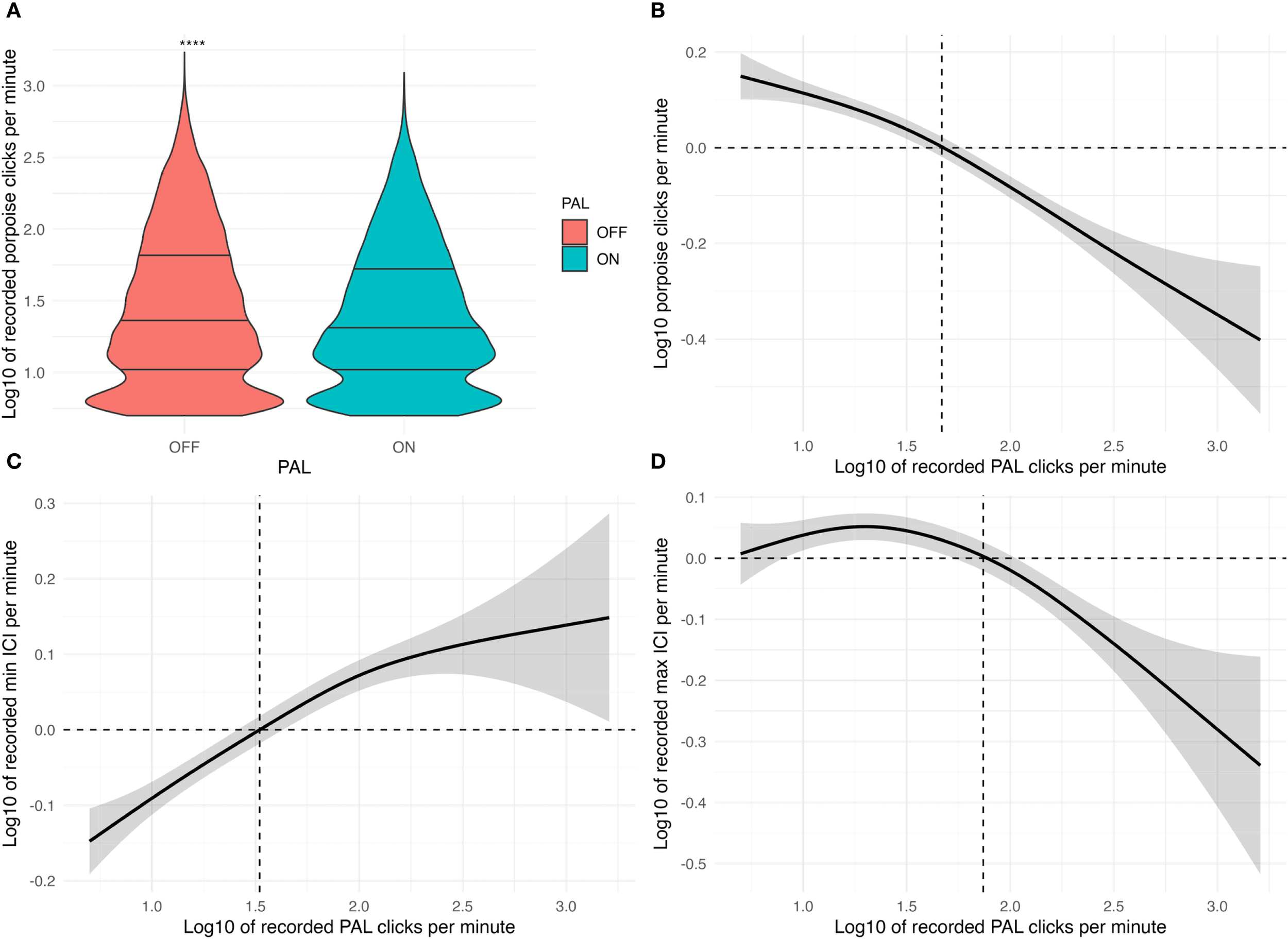 The effect of PAL signals on porpoise communication and behaviour: (A) shows a Violin plot of recorded porpoise clicks when PAL was on and off. (B-D) show Generalised Additive Model (GAM) plots showing the partial effects of received PAL clicks on selected variables such as porpoise click rate (B), minimum Inter-click-intervals (ICI) (C) and maximum ICI (D).