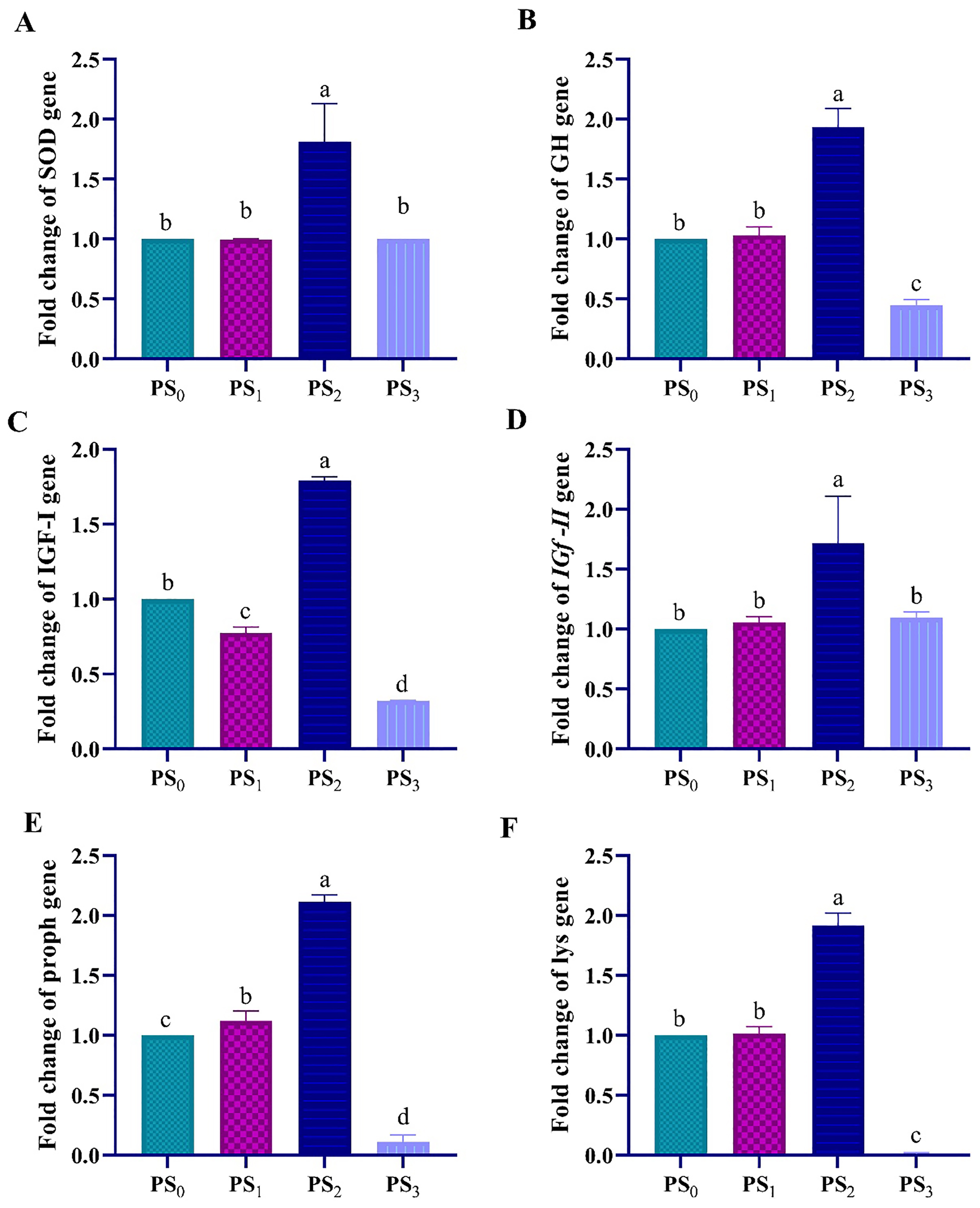 β-actin, beta-actin; proPO, Prophenoloxidase; SOD, Superoxide dismutase; Lys, Lysozyme; GH, Growth hormone; IGF-I, Insulin-growth factor 1, and IGF-II, Insulin-growth factor II.