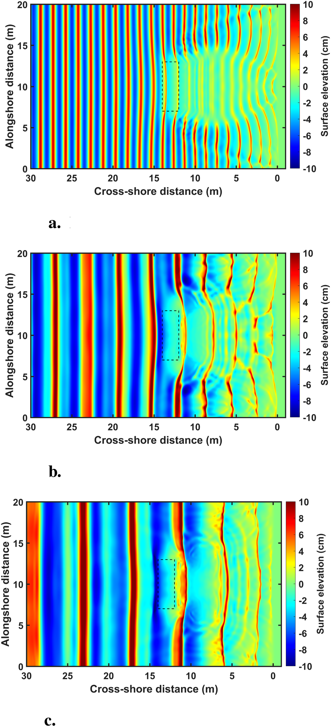 The numerical model employed in this study was initially validated against the benchmark results of Beji and Battjes (1993), while the modeling of free surface behavior was further validated through comparisons with the works of Lin and Li (2002); Stelling and Zijlema (2003); Yuan and Wu (2004); Bradford (2005). In addition, high-order dispersion characteristics in Boussinesq-type models were addressed by Lynett and Liu (2004). Furthermore, the model’s accuracy and scalability were demonstrated through comparisons with hydraulic model experiments on wave transformation and breaking phenomena in coastal environments (Berkhoff et al., 1982; Synolakis, 1987). Although the present study does not include a direct comparison with laboratory or field data, the numerical model employed herein has been extensively validated in previous studies under similar conditions. These studies demonstrated the model’s capability to accurately reproduce wave transformation, wave-induced currents, wave breaking and sediment transport. Therefore, the model results in this study are considered to be reliable within the defined scope.