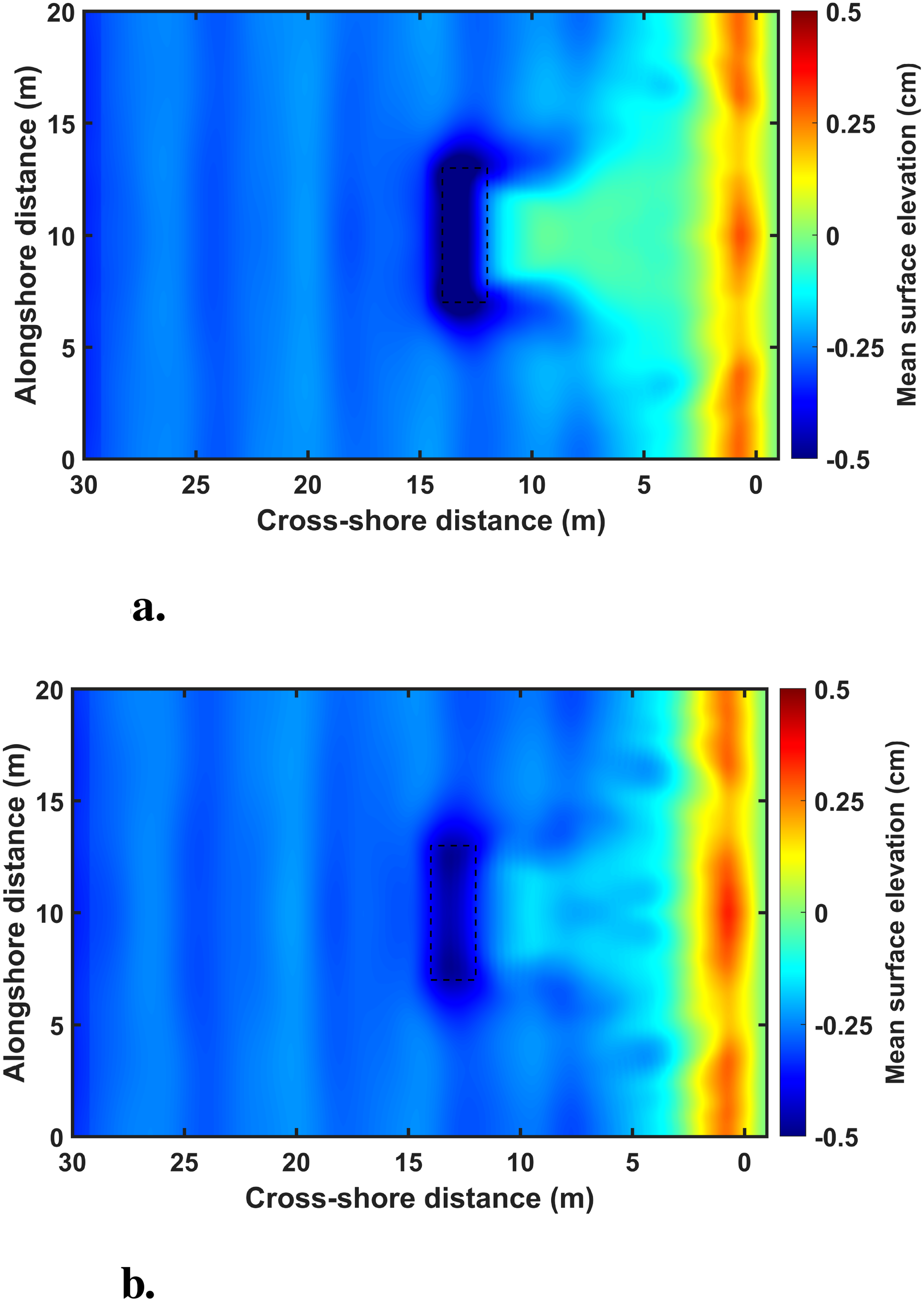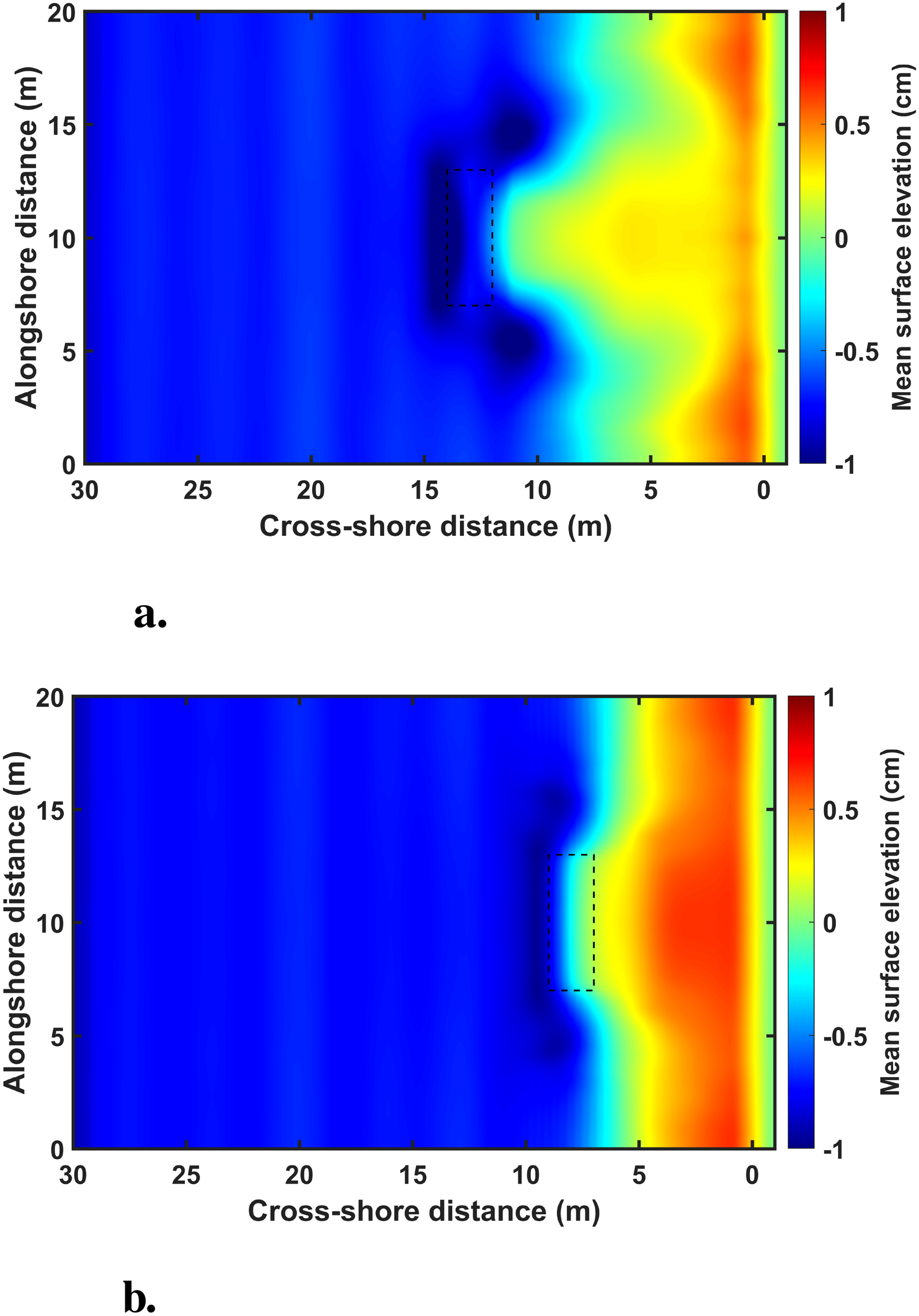 Mean surface elevations under H = 0.075 m and T = 3.0 s at the distance 13 m from the shoreline. (a) vertical distance 0.10 m from the water surface to the submerged structure crest (b) vertical distance 0.15 m from the water surface to the submerged structure crest.