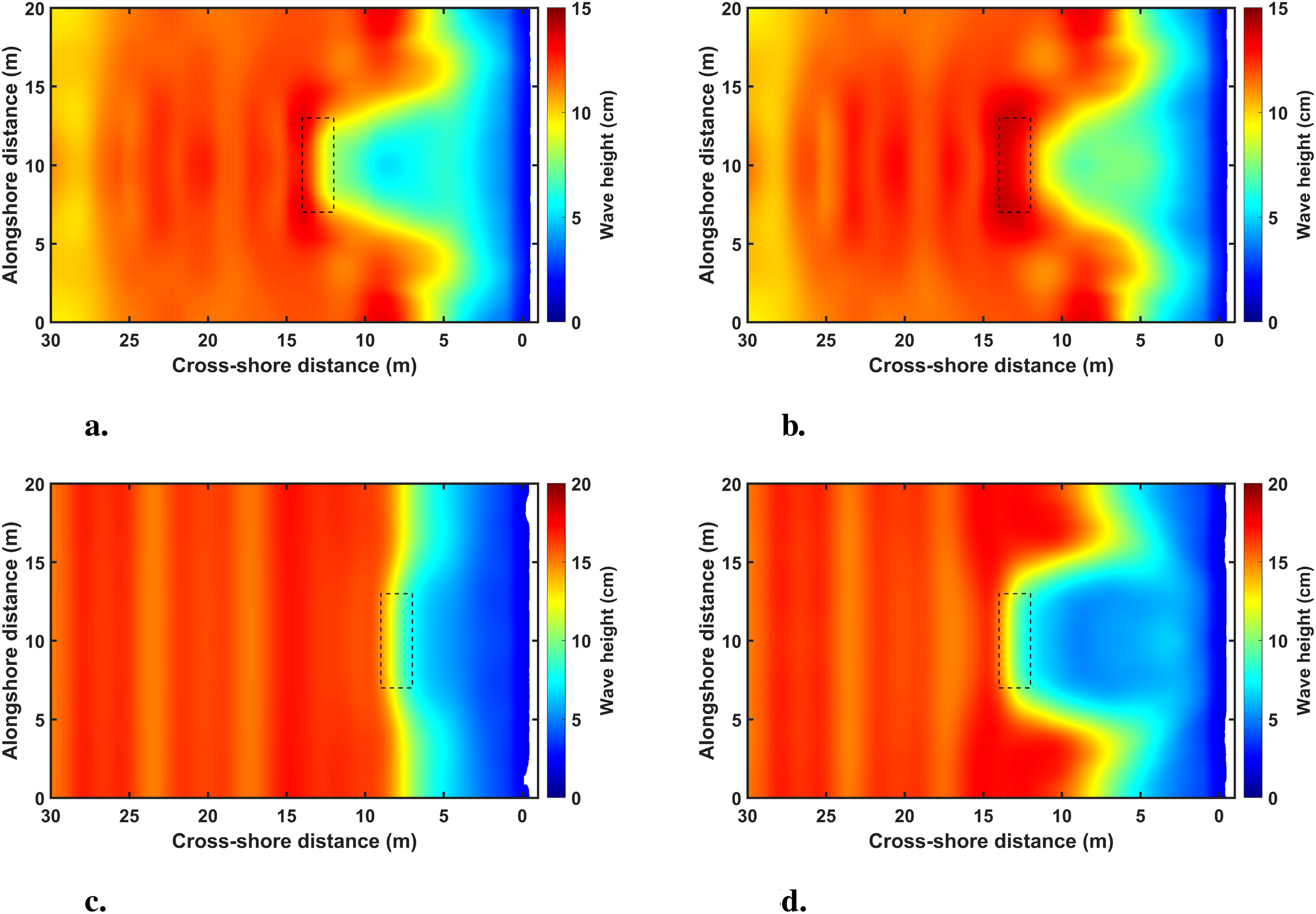 Wave height distributions as a function of incident wave conditions and submerged breakwater dimensions. (a) Case 6, lx = 13 m, sb = 0.10 m (b) Case 6, lx = 13 m, sb = 0.15 m (c) Case 11, lx = 8 m, sb = 0.15 m (d) Case 11, lx = 13 m, sb = 0.15 m.