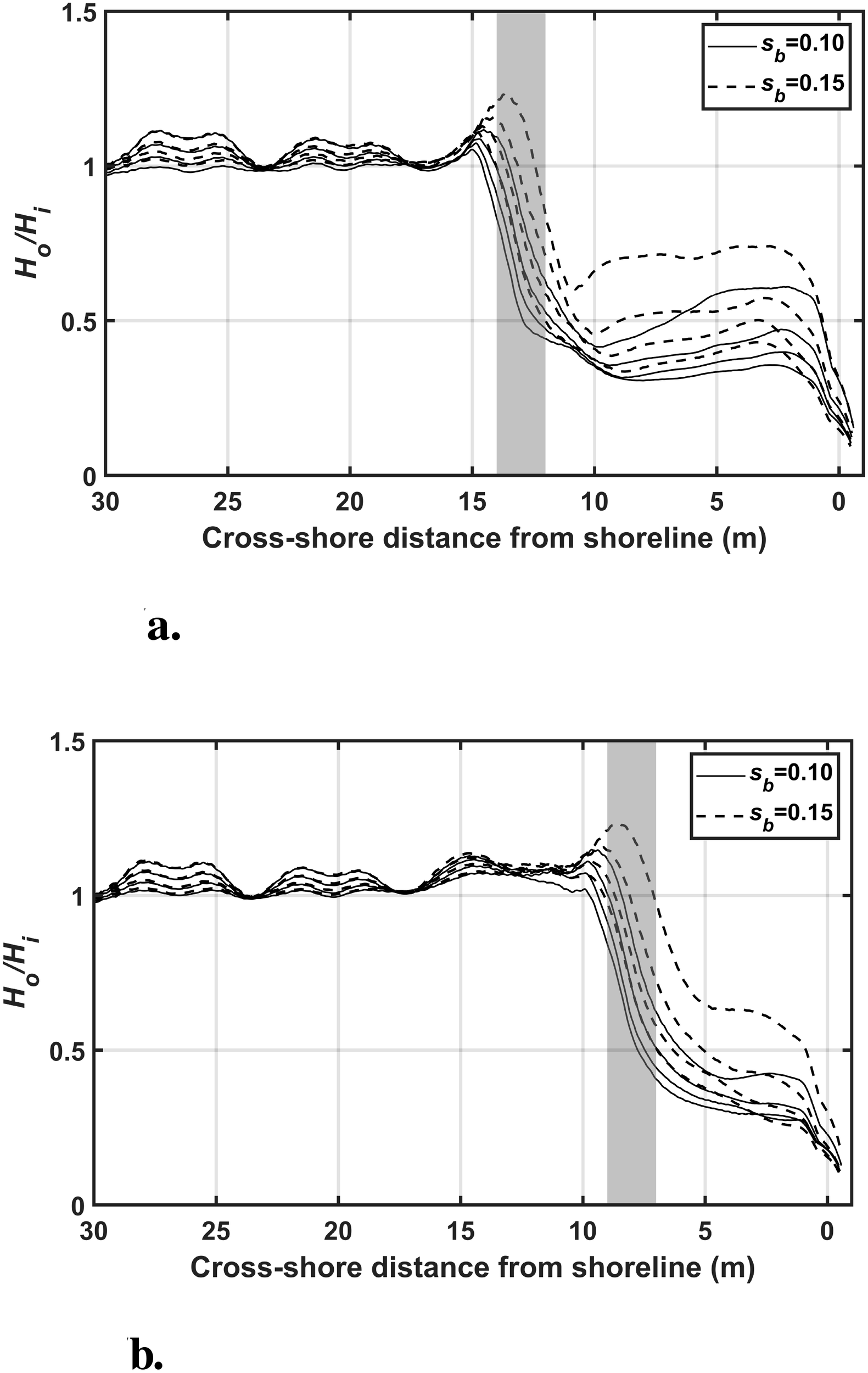 Wave height ratio (T = 2.0 s) of incident wave height to calculated wave height along the cross-shore distance from the shoreline. (a) the offshore distance 13 m from the shoreline (b) the offshore distance 8 m from the shoreline.