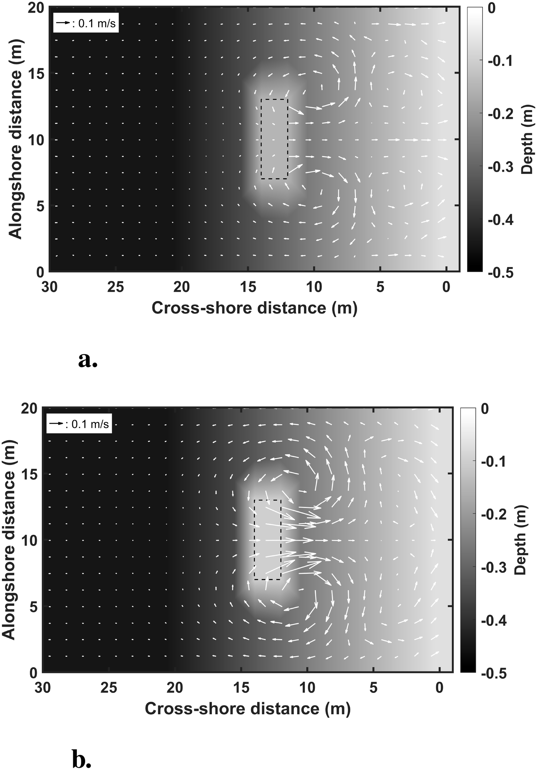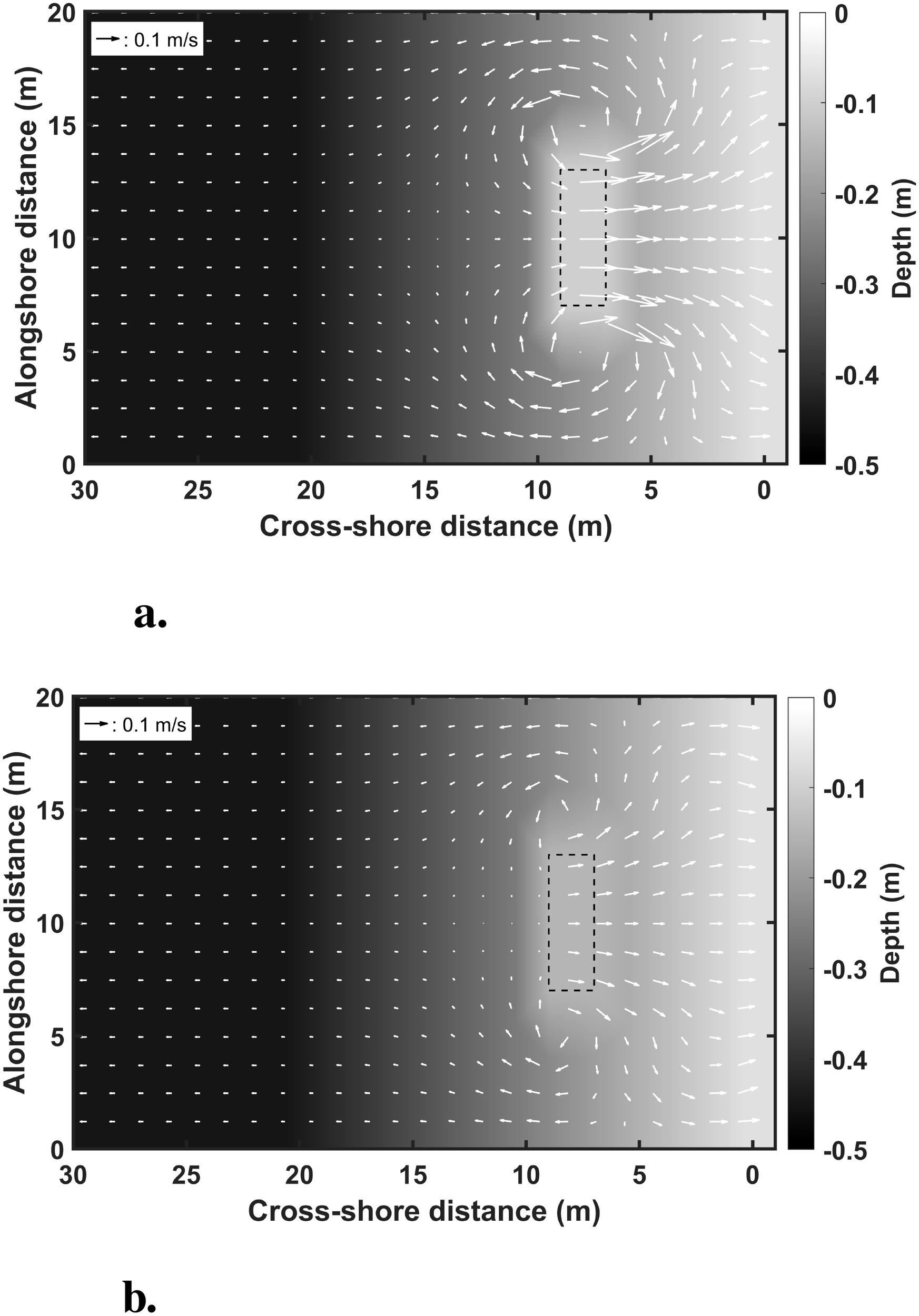 Velocity vectors about shoreline erosion response. (a) erosion flow pattern of lx = 8 m, sb = 0.10 m (b) erosion flow pattern of lx = 8 m, sb = 0.15 m.