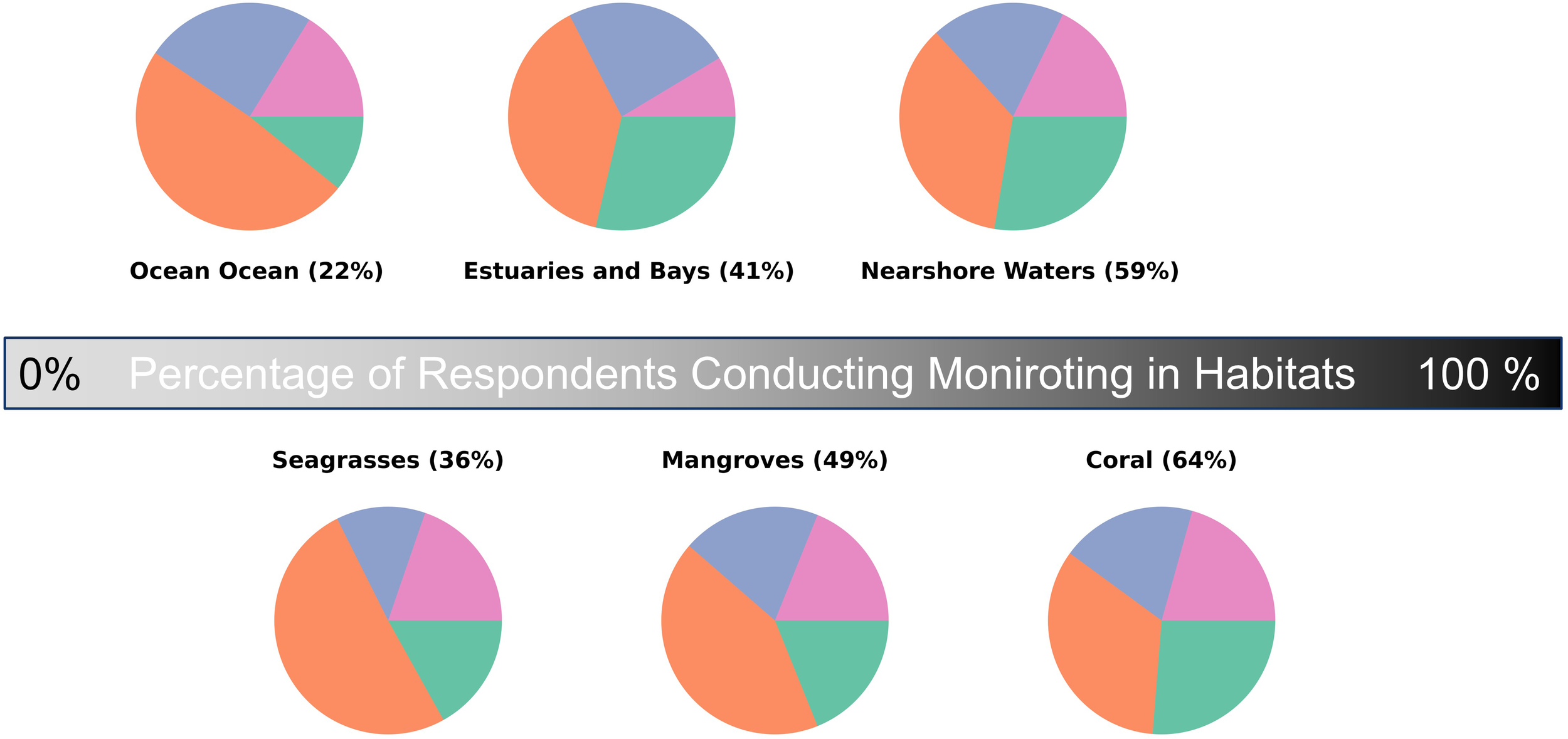 Ocean professionals in the Caribbean rely on nearshore marine environments due to their accessibility, and therefore, their strengths, interests, and expertise focus mainly on nearshore environments. Across the region, respondents are most concerned about coral reef health (58%) and water quality (51%) within their local marine environments. Over half of the respondents conduct research in nearshore environments (59%) compared to a much smaller fraction that work in the open ocean and offshore environments (22%). The most frequently studied ecosystems are coral reefs (64%), yet respondents also monitor other nearshore environments such as mangroves (49%), estuaries and bays (40%), and seagrasses (35%) (Figure 3). Other concerns for ocean health expressed by respondents, include harmful algal blooms (31%), sargassum inundation (27%), ocean acidification (21%), overfishing (22%), and climate change impacts such as hurricanes and sea level rise (29%) (Appendix C).