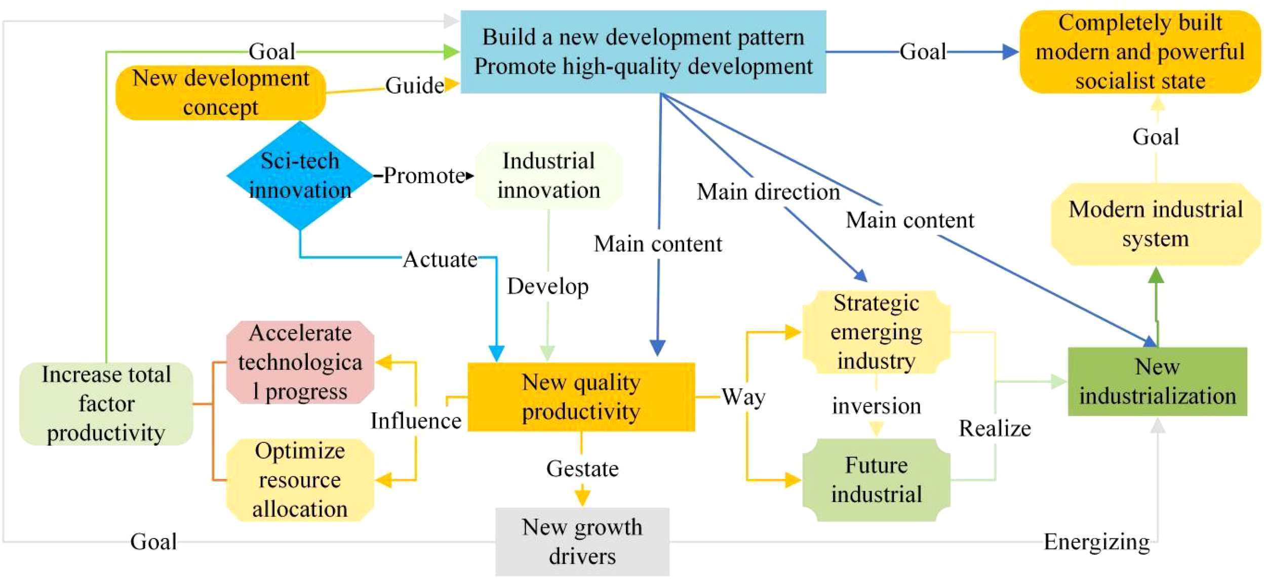 NQP represents an advanced form of production emerging in the digital, informational, and intelligent society. It arises from rapid technological breakthroughs, scientific and technological innovation, optimized allocation of production factors, and profound industrial transformation and upgrading. NQP comprises three core elements: (1) high-skilled laborers, (2) “new media” labor tools, and (3) “new material and quality” labor objects (Zhou and Xu, 2023). Key characteristics of NQP include:Scientific and technological innovation as the primary driver, Enhanced total factor productivity, Cultivation of emerging and future industries, High-quality development as the ultimate goal (Du et al., 2023). Technological innovation not only underpins the modern industrial system but also accelerates industrial advancement, fostering NQP. This, in turn, generates new growth momentum, supporting high-quality development and a modernized economic framework aligned with the new development philosophy (Qian and Wang, 2024). NQP is closely linked to strategic emerging industries and future industries. Over time, strategic emerging industries evolve into future industries, collectively advancing new industrialization and reinforcing the modern industrial system. This symbiotic relationship strengthens the foundation for new industrialization, ultimately contributing to the overarching objective of building a modern socialist society (Xi, 2013). (See Figure 1 for further details.)