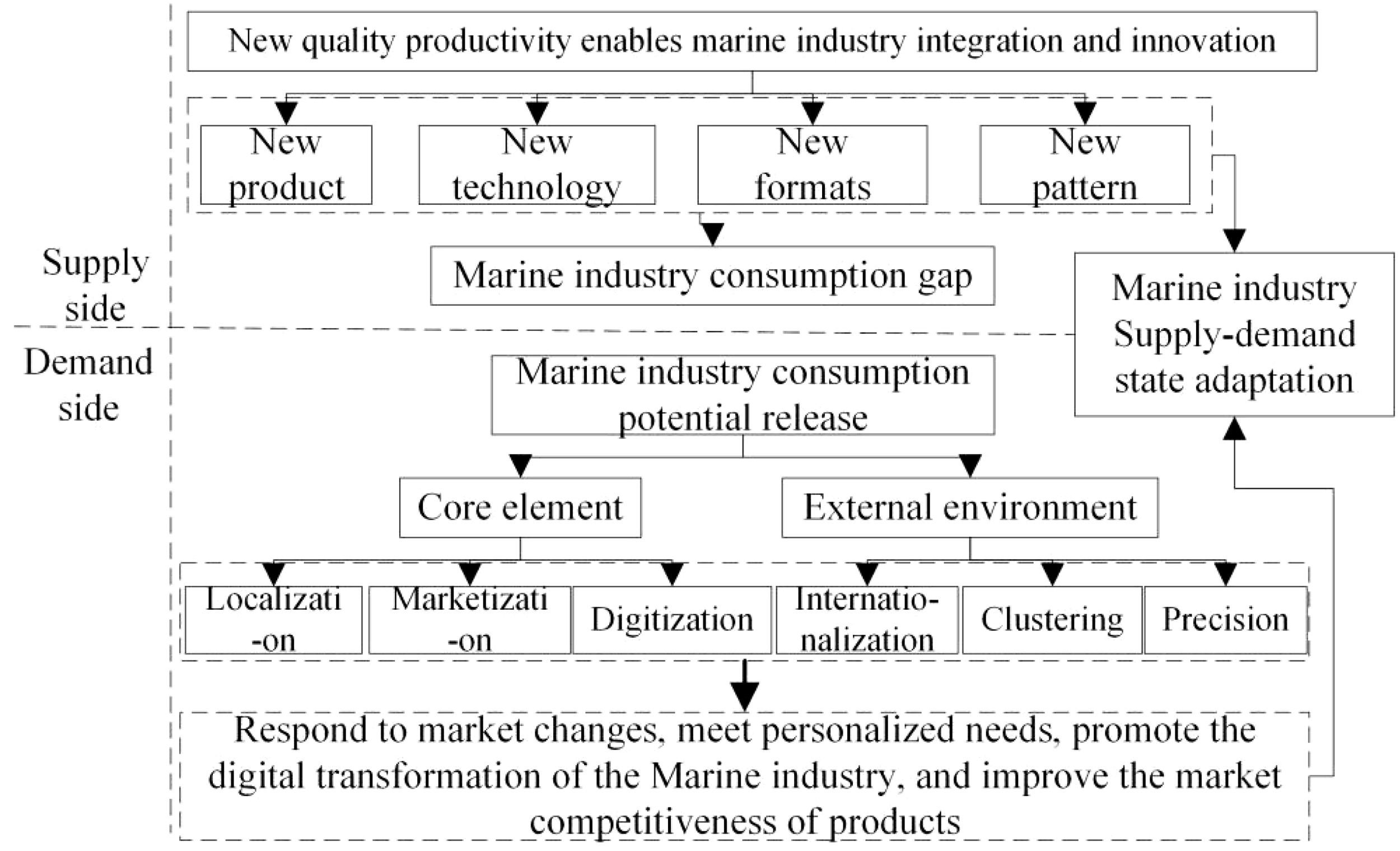 Specifically, in order to achieve the coordinated balance between the supply side and the demand side of the MMI, it is necessary to drive the NQP and promote the MMI to make breakthroughs in the aspects of factor innovation and process reengineering. At the same time, the NQP also needs to enable the MMI to make progress in configuration breakthroughs and digital reality interoperability. In this way, the transformation and upgrading of the MMI itself can be promoted, so as to realize the docking of the market side and the demand side with higher efficiency (Zhao and Wang, 2024). First of all, the NQP drives the factor innovation and process reengineering of MMI. In the marine industry, the optimal allocation and efficient utilization of various resources, technologies, talents and other elements are of great importance. The NQP will promote the more efficient and accurate matching of these elements, and thus promote the innovative development of the marine industry. At the same time, the promotion of NQP will also help the marine industry to realize the digitalization and intelligence of production processes, thereby improving production efficiency and product quality, spawning new products, business forms and development models, and making up for the gap in consumer demand in the marine industry. Secondly, the NQP enables the MMI configuration breakthroughs and numerical reality interwoven. In the MMI, diversity and flexibility of configurations are essential to respond to market changes and meet individual needs. The NQP will promote the diversification and personalization of the marine industry configuration to meet the needs of different customer groups. At the same time, the NQP will also promote the marine industry to achieve digital transformation, the deep integration of digital technology and the real economy, to achieve the digital upgrading of the marine industry. Finally, the NQP will promote the MMI to achieve more efficient market docking. Through digital technology, digital infrastructure, data information and other technical means, the NQP will help the marine industry achieve more accurate market positioning and product promotion, and improve the market competitiveness of products.