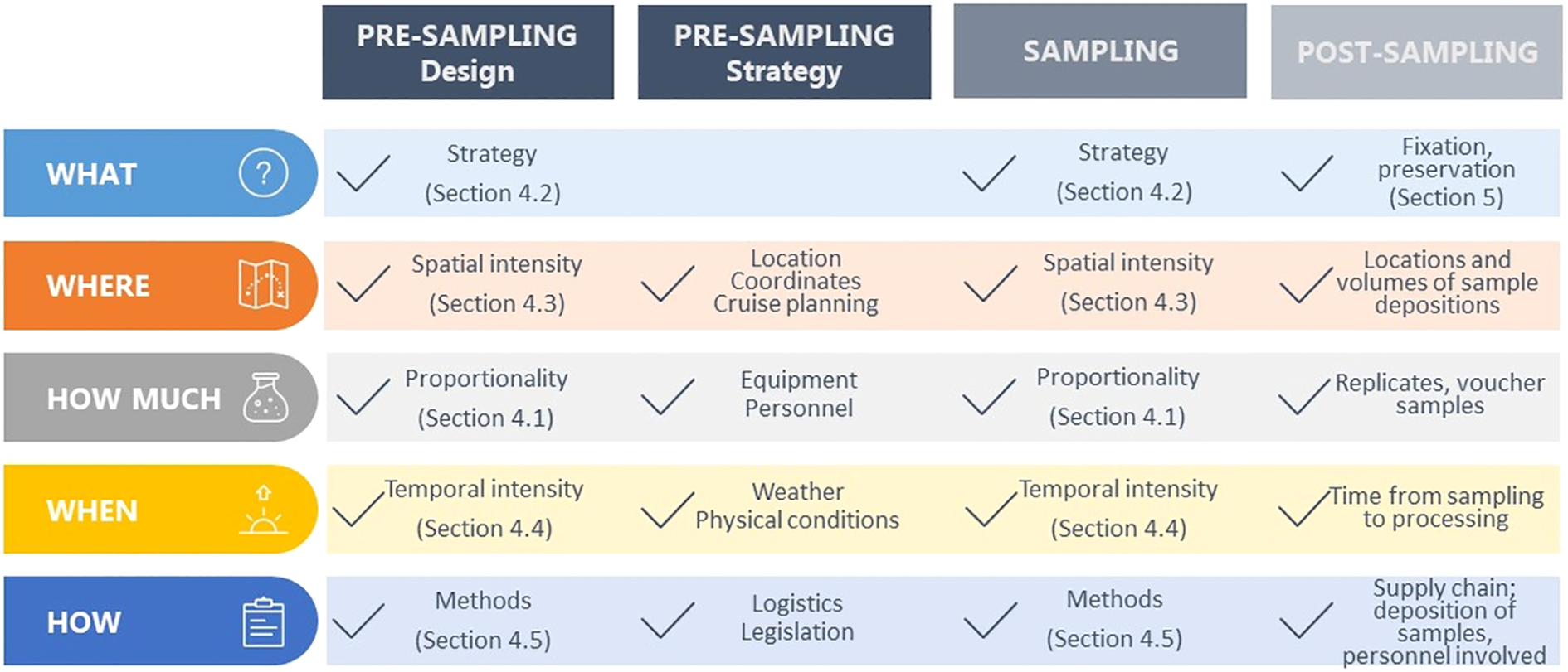 Findings from previous ecosystem surveys should be integrated into the newly developed sampling strategies. This means that samples should be selected to represent a range of habitats. For example, according to the Monitoring and Sampling Manual (Water Quality and Investigation, Department of Environment and Science, 2018), water samples should be taken at a given location at approximately the same time of day or following some other natural rhythm, such as tides. Beside the daily rhythm, it is also essential to have in mind possible extreme events that can influence microbial communities like storms, heatwaves, or algal blooms. Due to the continuous and available meteorological monitoring, those events are easily visible and their possible influence on the environment needs to be addressed prior to the sampling to choose the appropriate sampling site and time. This allows for a direct comparison of survey results over time and an accurate assessment of changes. Technical guidance on appropriate sampling design is also important to maximize predictive success along environmental gradients in all areas of biology and ecology.