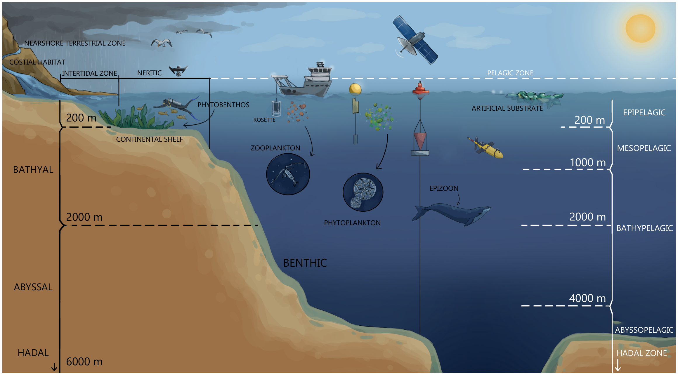 | Pelagic habitats | a) sunlight zone (epipelagic) b) twilight zone (mesopelagic) c) midnight zone (bathypelagic) d) abyssal zone (abyssopelagic) e) hadal zone (trenches) |