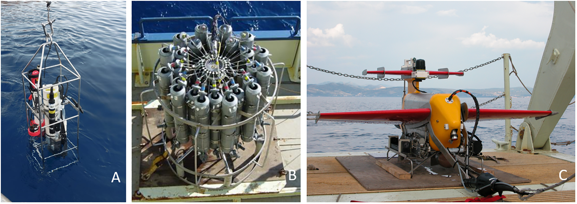 Various CTD probe set up: CTD equipped with additional instruments deployment (A); Rosette with Niskin samplers and CTD (B); CTD mounted in a vehicle that is towed by a research vessel (C).