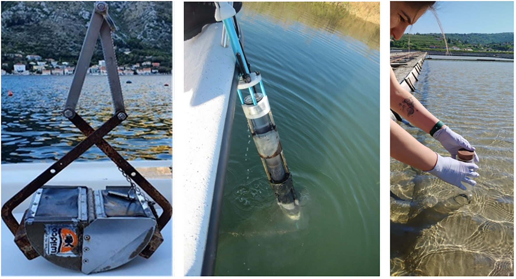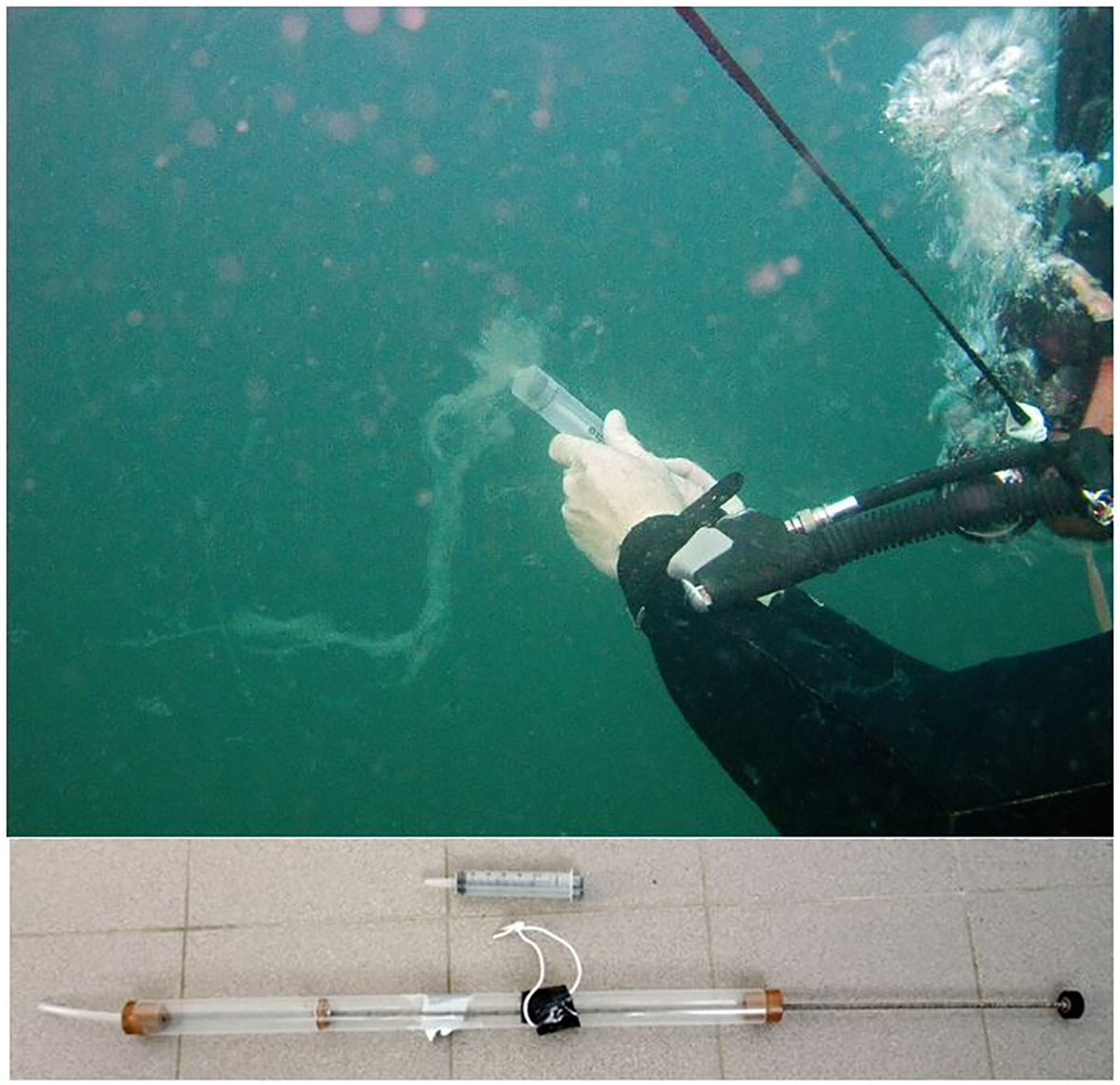 An excellent added value to the sediment and water column methods described above is scientific diving. The main advantage of diving is the ability to collect fine samples of benthic organisms and the water column. Also, unless the sampling tools described above are equipped with photographic or video cameras, a broader picture of the sampling area is not readily available. This can result in collecting samples which may or may not be representative. However, even if the sampling tool is equipped with a camera, the information can be overlooked due to the decreased visibility along the water column, sediment resuspension, resolution or equipment malfunction. In shallower areas, properly trained SCUBA divers are able to explore and perform direct hand sampling using various tools for sample collection, such as cores or photographic and video recording (Novosel et al., 2004; Kružić et al., 2012; Zunino et al., 2018), or deploy sensitive scientific equipment (Orlić et al., 2011) (Figure 7).