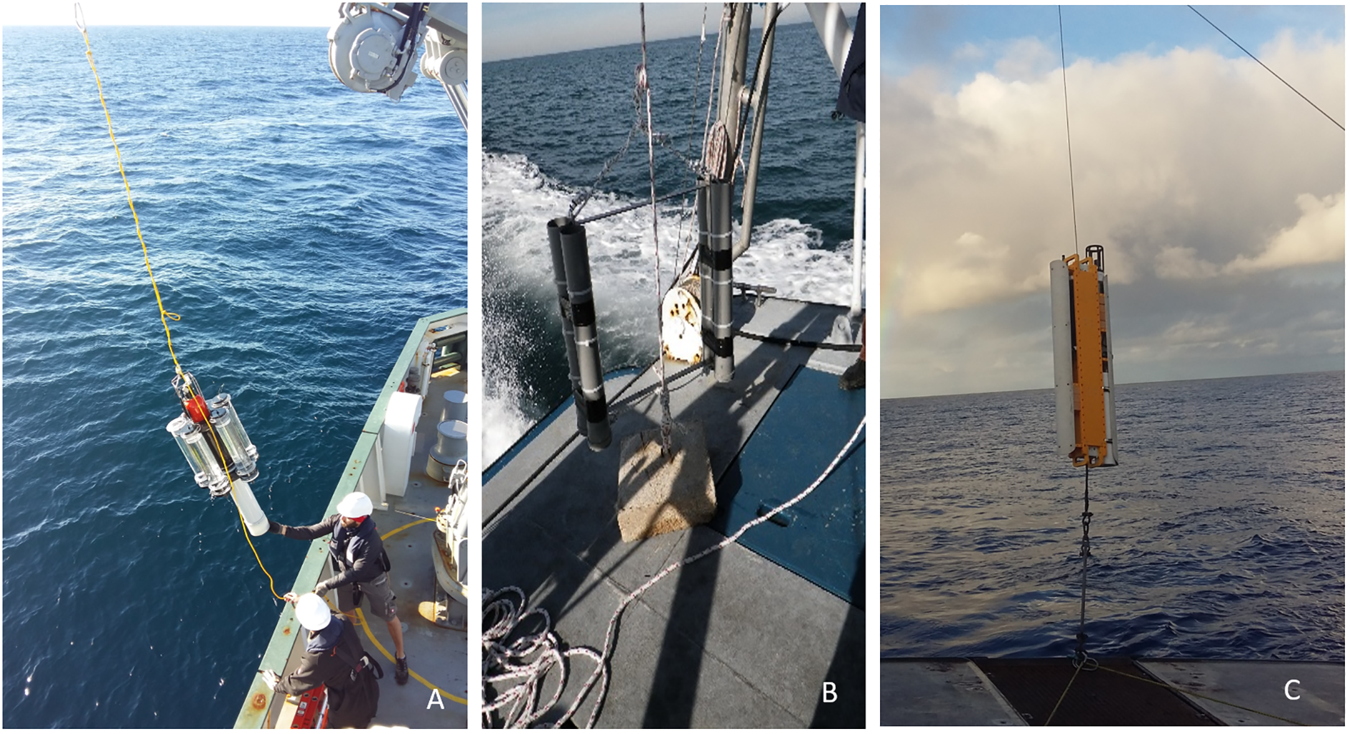 Autonomous platforms equipped with various sensors and sediment traps: Neutrally buoyant sediment trap (A), Sediment traps (B), Wire-walker (C).