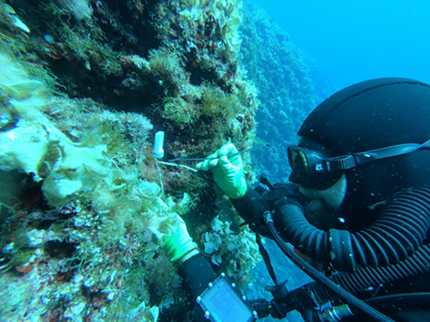 Underwater manual sensor mounting by diver.