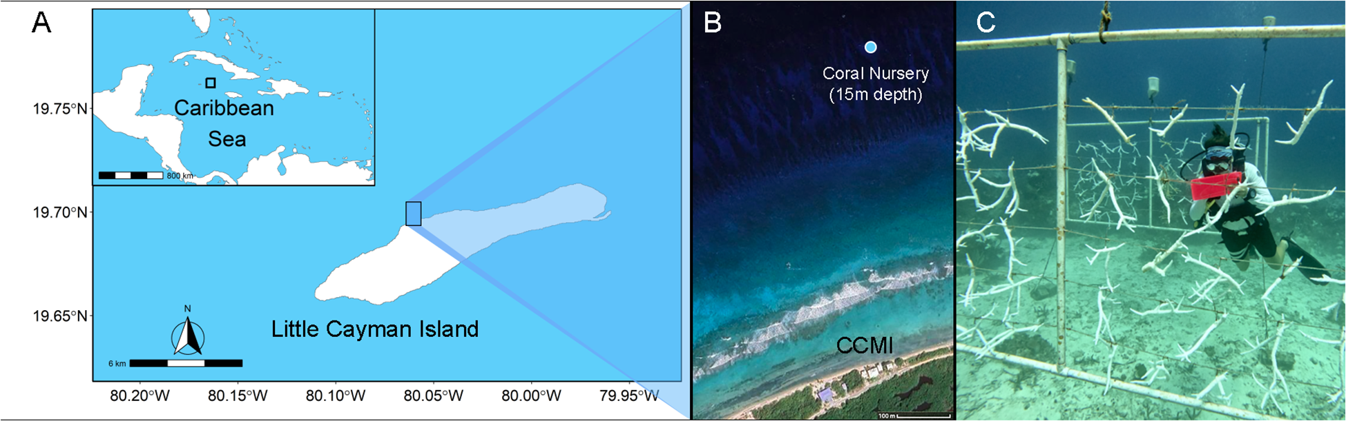This work took place in CCMI’s A. cervicornis nursery on the north coast of Little Cayman Island that was originally established in 2012 (19.329858, -81.252361; Figure 1A). The nursery is located on the northern side of Little Cayman, roughly 700m from shore at a depth of 16 – 18m (Figure 1B). All corals maintained in the nursery were collected from wild colonies around the island between 2012 and 2018. At the onset of the study the nursery contained 415 A. cervicornis individuals, which represented 10 unique genetic identities (Drury et al., 2017; Brown et al., 2022), referred to hereafter as genotypes B, G, K, LG, O, OB, OR, R, S, and Y, dispersed among 11 vertical frames (Figure 1C). Frames were 3-m wide by 1.5-m high and constructed of PVC with corals hanging from horizontal monofilament lines. The structures were anchored using ropes tied to cinderblocks and held upright by empty plastic jugs partially filled with compressed air. Frames were ~ 1–3 m away from any other frame, and each contained a minimum of 3 different genotypes.