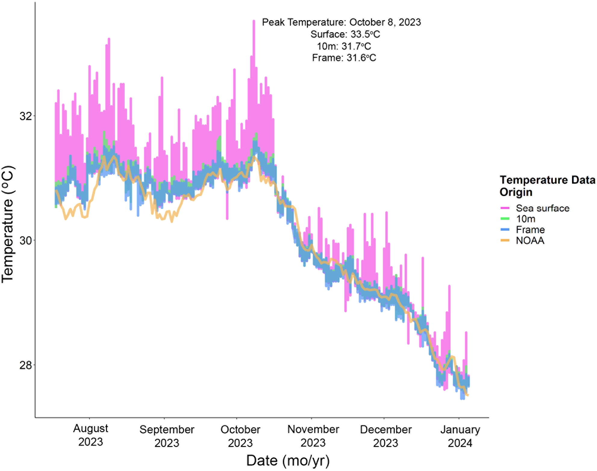 Seawater temperature data recorded from HOBO loggers at the sea surface (pink), 10m depth on the nursery mooring line (green), and 15m depth on a nursery frame (blue). The orange line depicts estimated SST from the NOAA Coral Reef Watch Virtual Stations monitoring. In situ temperature data began on July 18, 2023 and ended on January 6, 2024.