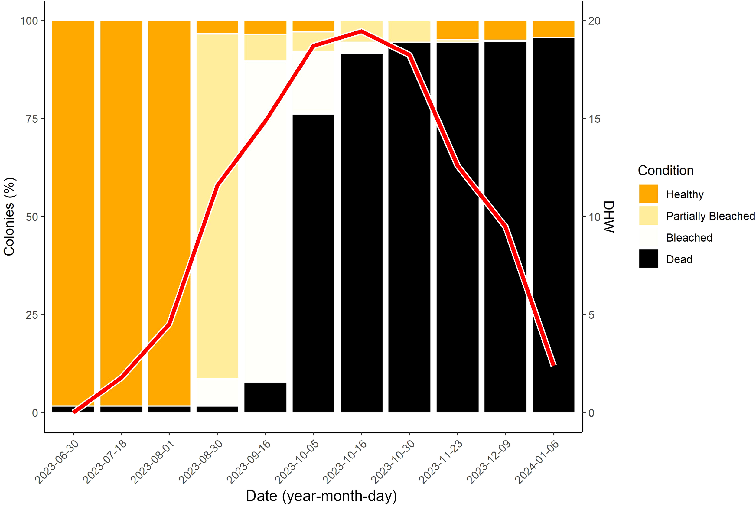 Stacked bar plot of coral conditions (Healthy, Partially Bleached, Bleached, Dead) over the sampling period. The solid red line represents estimated DHW from the NOAA Coral Reef Watch virtual stations during the sample period, with DHW values depicted on the Z-axis.