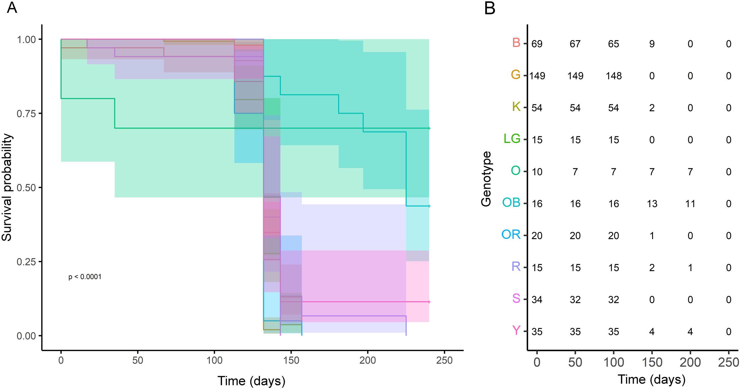 (A) Kaplan Meier survival curve by genotype over time showing significant differences in survival probability by genotype (p < 0.0001). (B) Number of colonies per genotype at risk of mortality over time estimated by the Kaplan Meier curve. Genotypes are represented by unique color identities across both panels.