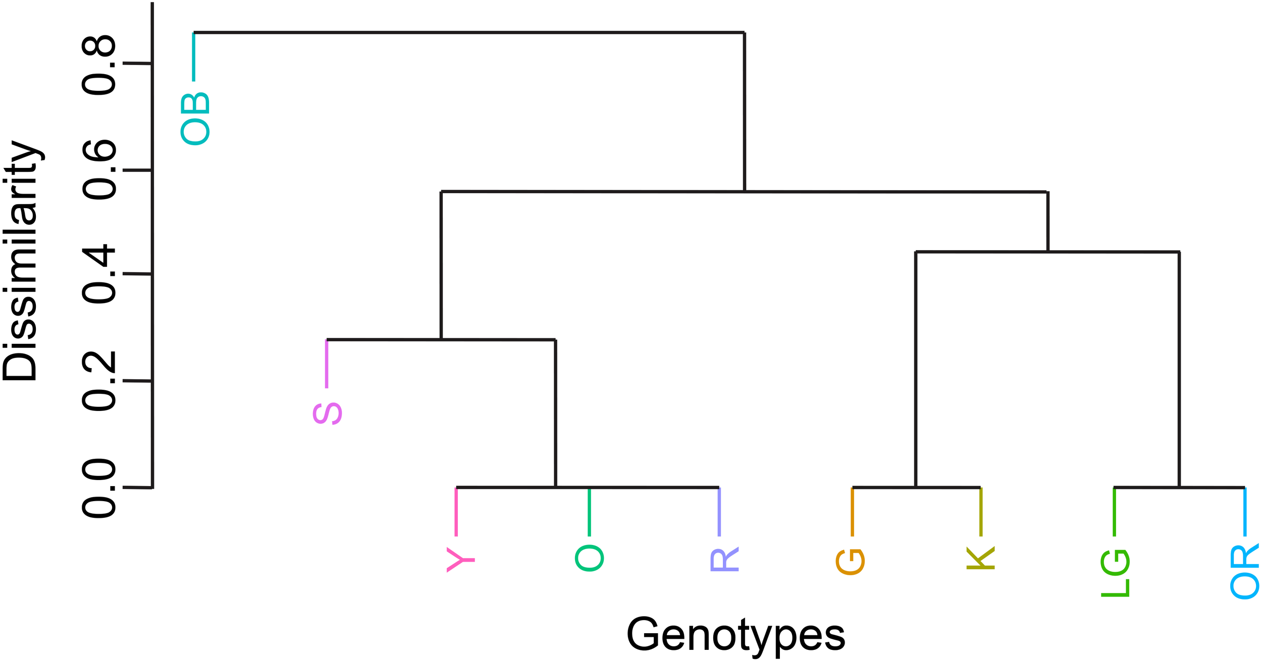 Hierarchical clustering of genotypes based on survival dissimilarities revealed distinct groupings (Figure 6). Genotype OB, which suffered the lowest mortality, formed its own distinct cluster. The remaining genotypes grouped into two main clusters: one containing Y, O, R and S, and another divided into two sub-clusters of G and K, and LG and OR.