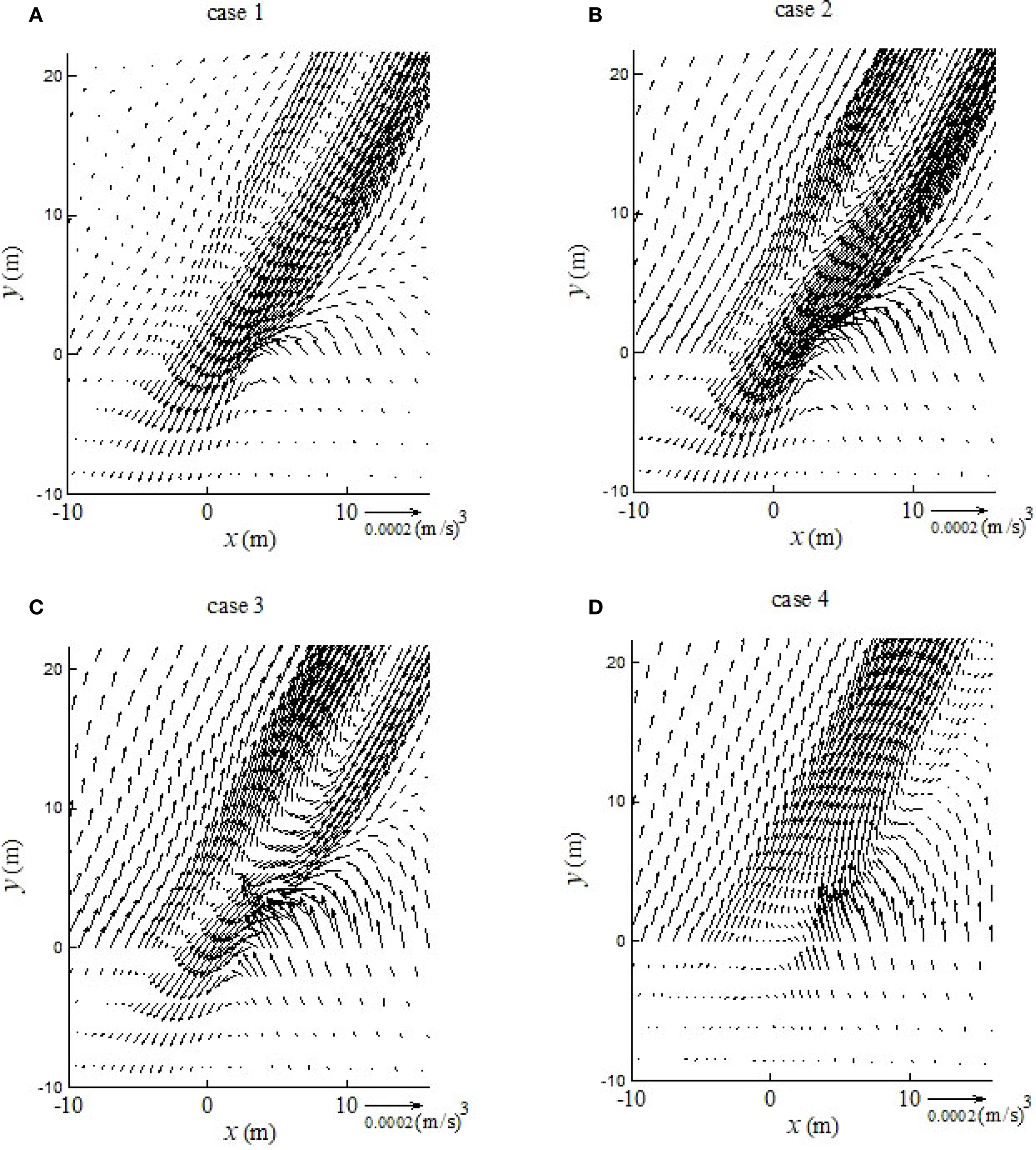 Spatial variations of divergence of pseudo residual sediment transport flux (m2/s3) for cases 1 (A), 2 (B), 3 (C) and 4 (D). The pseudo residual sediment transport flux is defined by Equation 20.