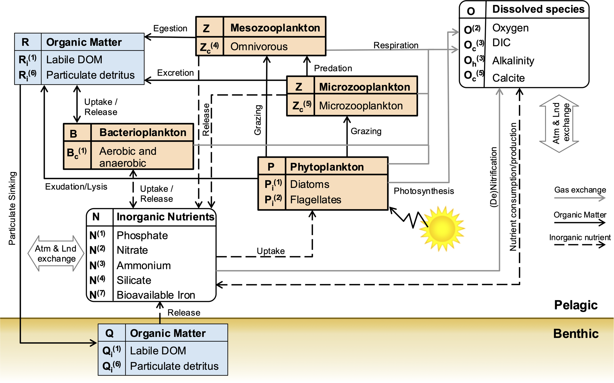 The model organizes elemental components—carbon, nitrogen, phosphorus, silicon, iron, and oxygen—into chemical functional families, forming the structural elements of both living functional groups and non-living organic matter. Biogeochemical cycling is solved independently for the following dissolved components: nitrate (NO3-), ammonium (NH4+), phosphate (PO43-), silicate (SiO44-), iron (Fe), and oxygen (O2). The ocean carbonate system is modeled with dissolved inorganic carbon (DIC) and total alkalinity as prognostic state variables, following the best practices outlined by Orr et al. (2017). The lower-trophic level ecosystem interactions represented in this study by the BFM can be considered of intermediate complexity (see, e.g., Lovato and Butenschön, 2023). The ecosystem structure accounts for five living functional groups: heterotrophic bacteria, two phytoplankton groups (diatoms and nanoflagellates), and two zooplankton groups (microzooplankton and mesozooplankton). A schematic diagram illustrating the relationships and interactions between the different model components is provided in Figure 2.