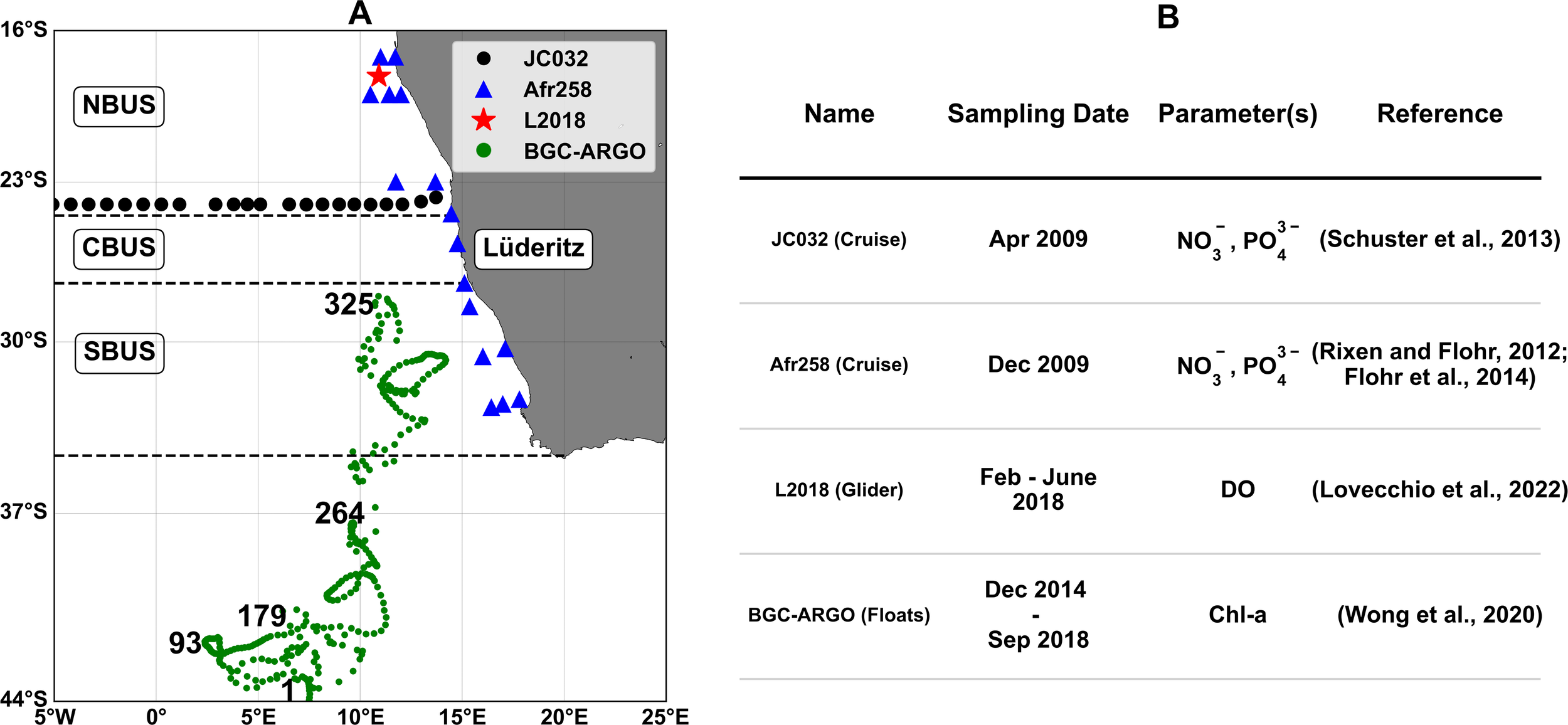 Location (A) and source details (B) of the diverse in-situ measurements collection used to validate the BENGUELA16 biogeochemical component. NBUS, CBUS, and SBUS refer respectively to the Northern, Central, and Southern Benguela subregions. The green dots represent the BGC-ARGO observations profiles (Wong et al., 2020), where labels indicate the prospective locations of the float over time.