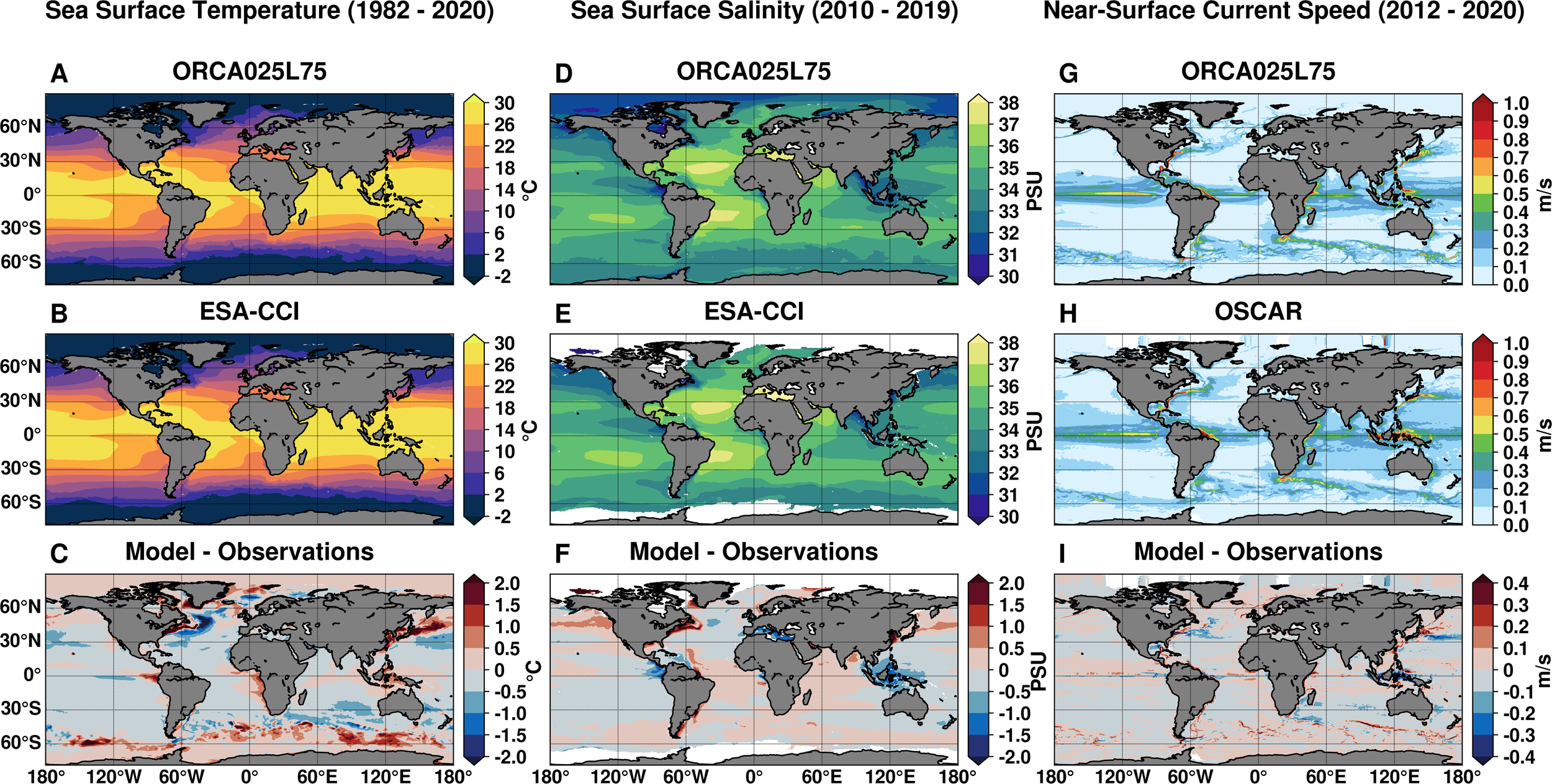 Long-term average climatological fields for sea surface temperature (A–C), sea surface salinity (D–F), and near-surface current speed at 15 m depth (G–I). For each variable, panels show output from the ORCA025L75 (A, D, G), corresponding observational datasets from ESA-CCI (B, E) and OSCAR (H), and the model–observation differences (C, F, I).