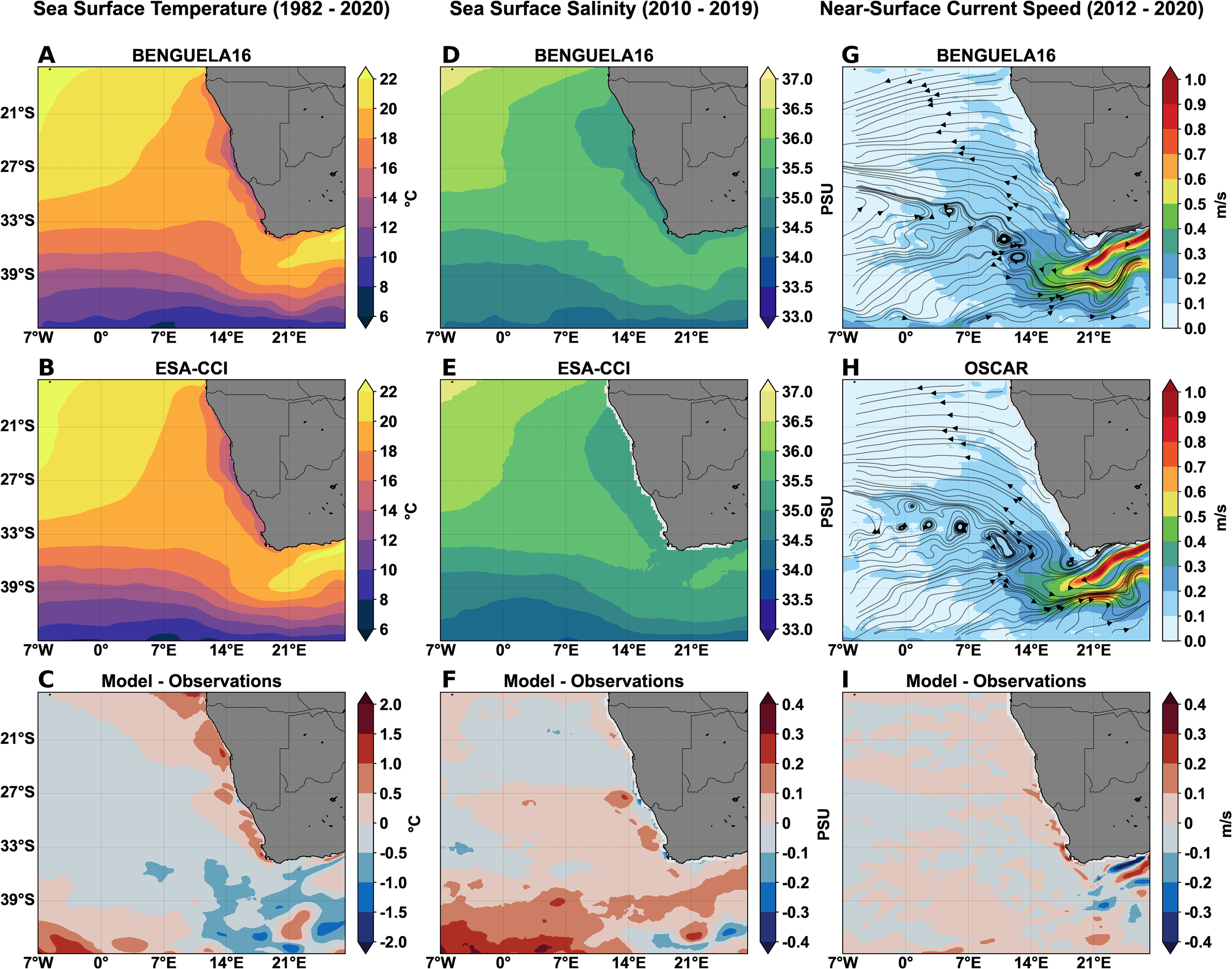 Long-term average climatological fields for sea surface temperature (A–C), sea surface salinity (D–F), and near-surface current speed at 15 m depth (G–I). For each variable, panels show output from the BENGUELA16 (A, D, G), corresponding observational datasets from ESA-CCI (B, E) and OSCAR (H), and the model–observation differences (C, F, I). Streamlines in (G, H) represent circulation directions at 15 meters, where lines were subsampled every 10 grid points to enhance plotting clarity.