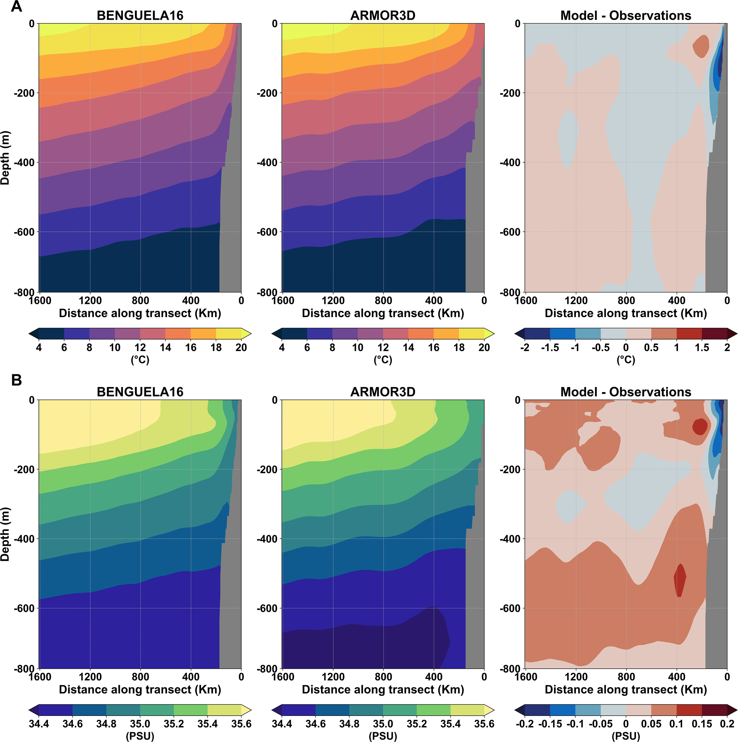 Seawater temperature (A) and salinity (B) climatological fields (1993-2020) along a longitudinal section at approximately 26.64°S, derived from the BENGUELA16 simulation (left panel), ARMOR3D analysis (CMEMS, 2022) (center), and their differences (right).