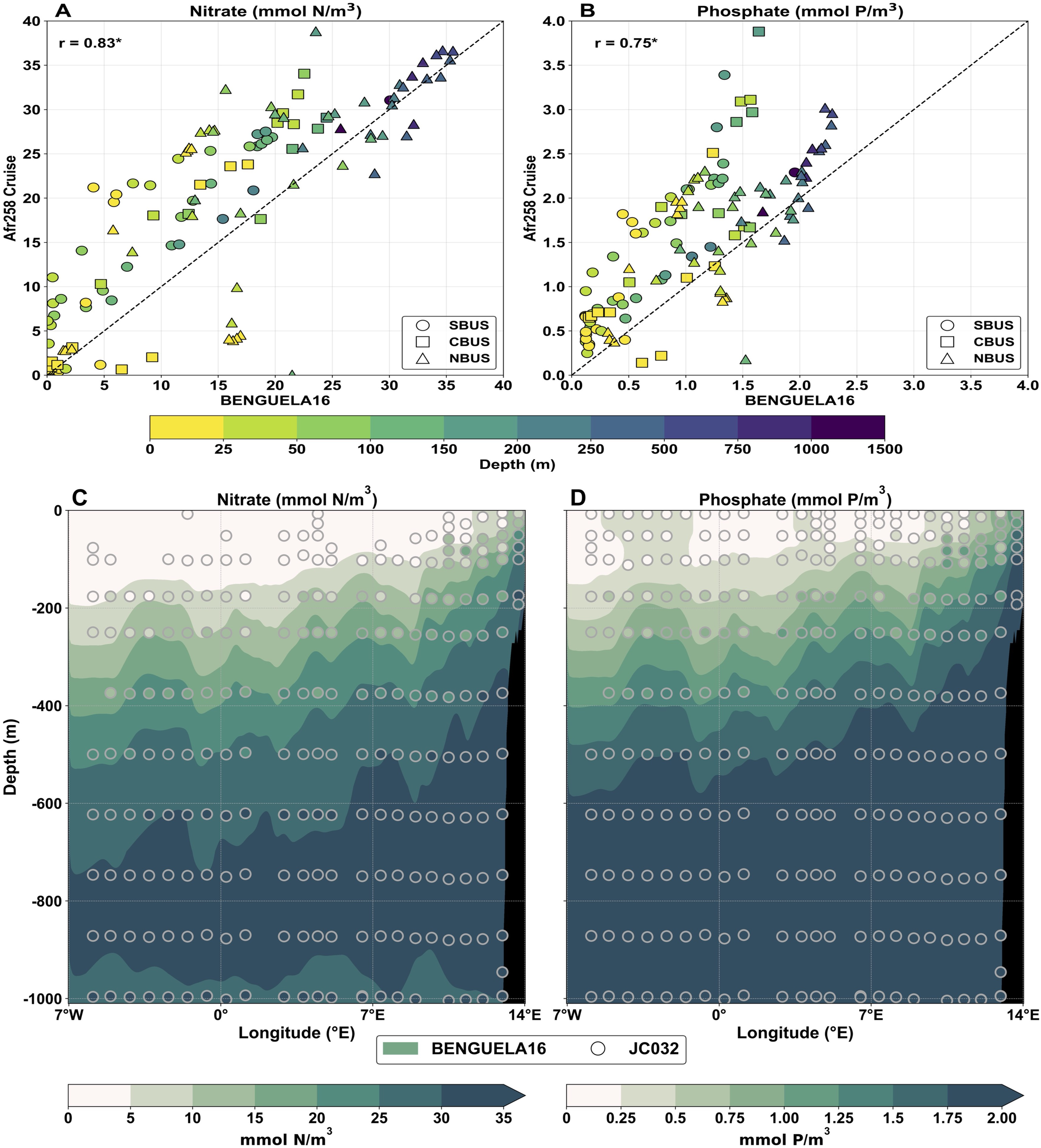 Comparison of BENGUELA16 monthly averaged data for dissolved inorganic nitrate and phosphate against in-situ measurements from Afr258 (A, B) and JC032 (C, D) cruises (see Figure 3 for details). In the top panels, the unequally spaced color scale indicates the depth of samples, while different subregions are associated with symbols. Model data were extracted at the nearest grid cell and sampling date, with values linearly interpolated at the same in-situ sample depths. The dashed line indicates the ideal fit and the Pearson’s correlation coefficient (r) is marked with an asterisk if statistically significant (p < 0.05). In the bottom panels, the BENGUELA16 data were extracted along a longitudinal section at about 24°S which reflects the JC032 cruise path without using any interpolation procedure.