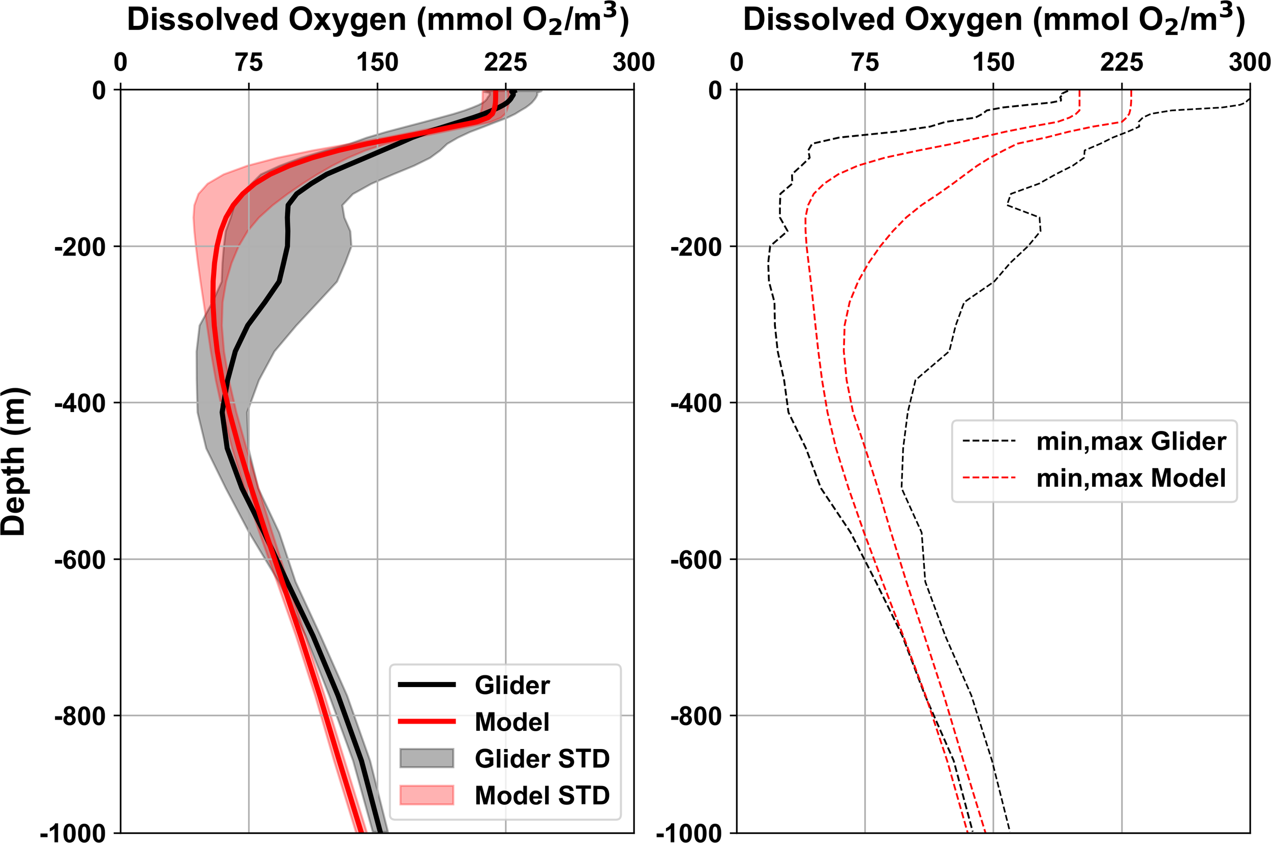 Vertical profiles of the mean and standard deviation range (left panel) and minimum-maximum interval (right panel) computed between February and June 2018 from daily dissolved oxygen glider data (black) and daily BENGUELA16 simulation (red). Model data were extracted at the nearest grid point with respect to the glider reference location (see details in Figure 3A).