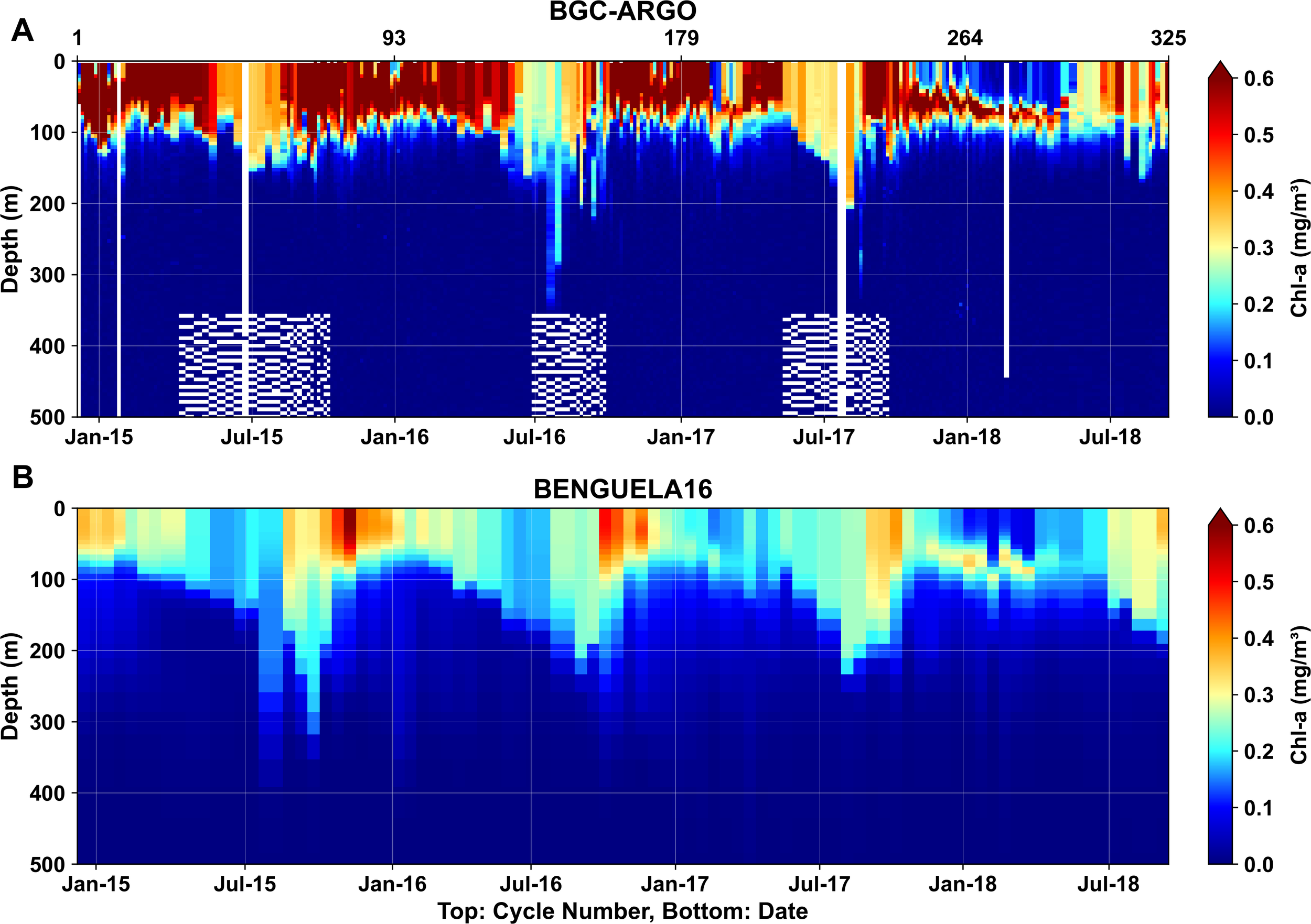 Chl-a vertical distribution was assessed using 325 profiles collected by Biogeochemical Argo (BGC-ARGO) float number 6901582 between December 2014 and September 2018 in the open waters of the southern Benguela subregion, extending from the surface to 1000 m of depth (Wong et al., 2020). Daily dissolved oxygen observations were derived from a high-resolution glider deployed from February to June 2018 in the NBUS (Lovecchio et al., 2022). The glider followed a ~12 km triangular path and profiled to 1000 m depth with ~20 cm vertical resolution, surfacing 5–6 times daily and sampling primarily on upward dives.