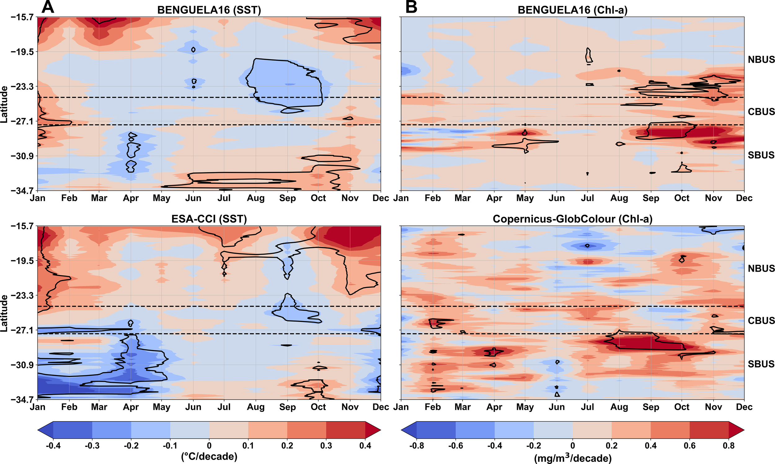 In general, the trends derived from the BENGUELA16 SST data show strong coherence with those from the ESA-CCI dataset (Figure 13A). A cooling trend of -0.12 °C per decade is identified between 20°S and 26°S, with the model indicating a broader seasonal span from August to October. This negative trend extends into the central Benguela subregion. However, in this area, the two datasets show contrasting signs in the trends during the austral summer. Both datasets indicate cooling across the southern subregion during the austral summer, though ESA-CCI reveals a more intense and seasonally extensive cooling, with trends reaching up to -0.64 °C per decade, compared to a maximum of -0.24 °C per decade in the model.